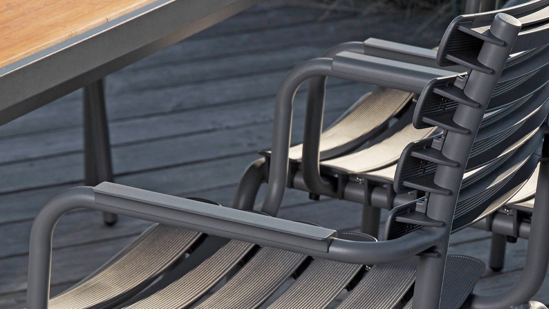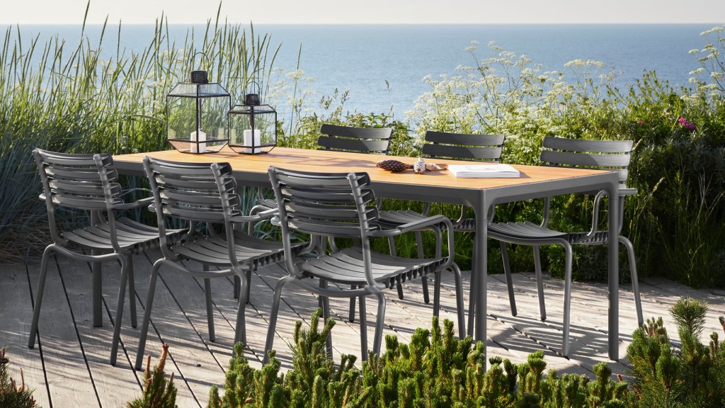 HOUE ReClips Dining collection: Lightweight with a minimalist design. Made from fully recycled plastic! The garden chair is designed by Henrik Pedersen, a Danish designer known for the iconic Click! Available in 4 colors, with bamboo or aluminum armrest.