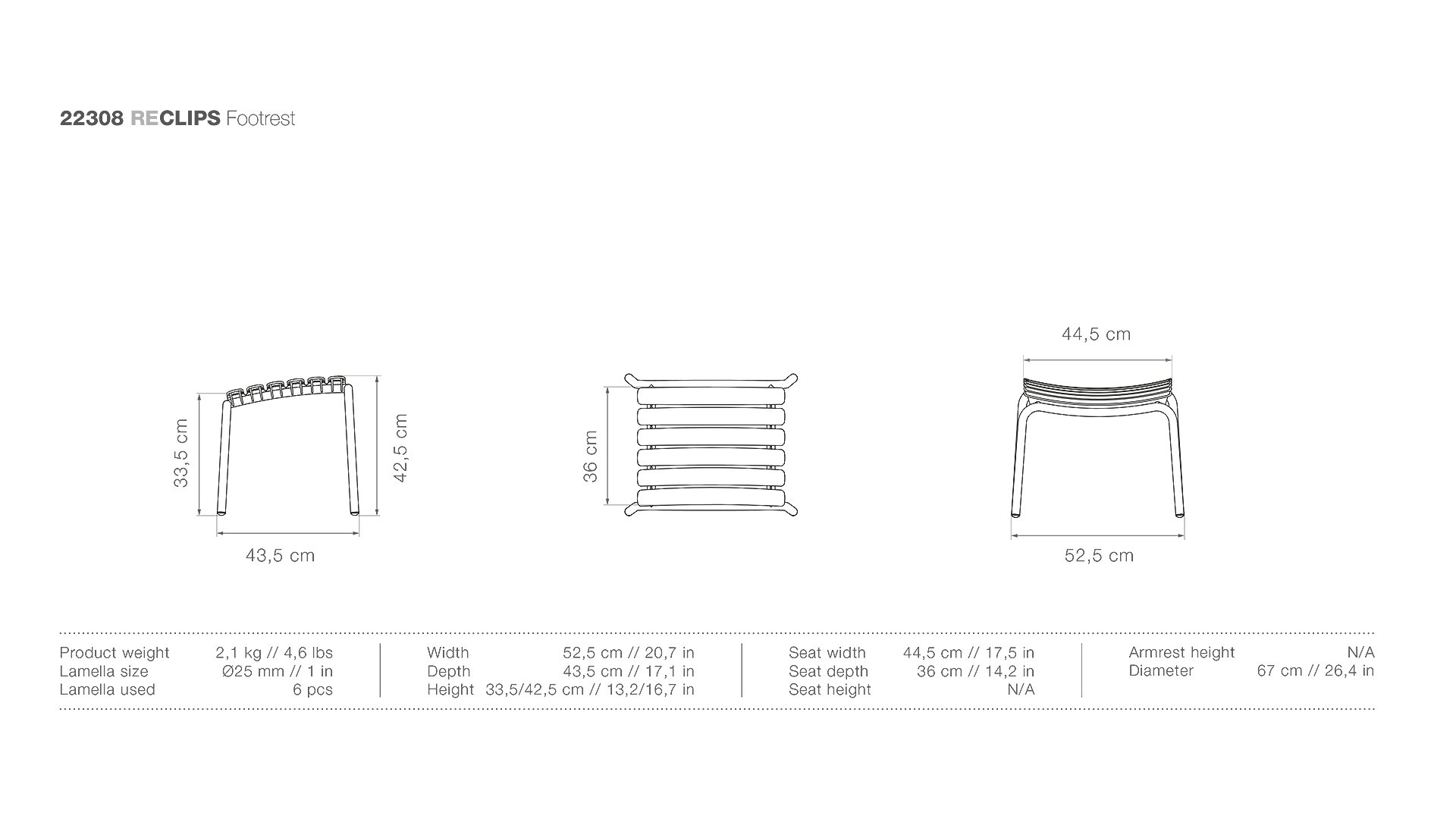 The Houe Reclips footrest is suitable for the Reclips Lounge Chair. The frame is made of powder-coated aluminum and the slats are made of recycled plastic.