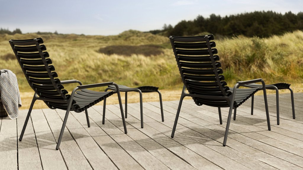 The HOUE Reclips series is made from recycled plastic. Combined with the powder-coated aluminum frame, this is a maintenance-free lounge chair. The ergonomically shaped backrest makes the chair very comfortable to use without a cushion. In this series, there are also a bar stool, garden chair, and a rocking chair available.