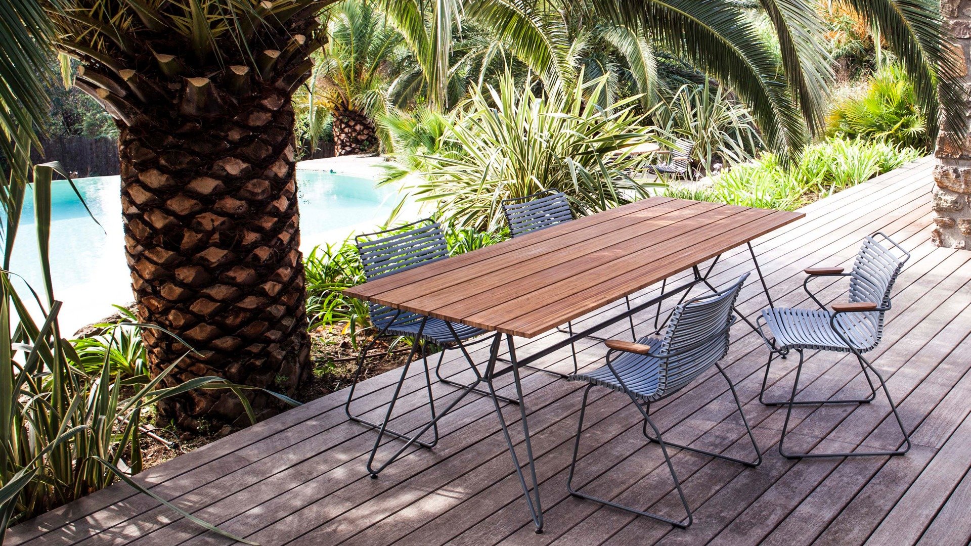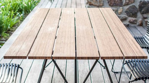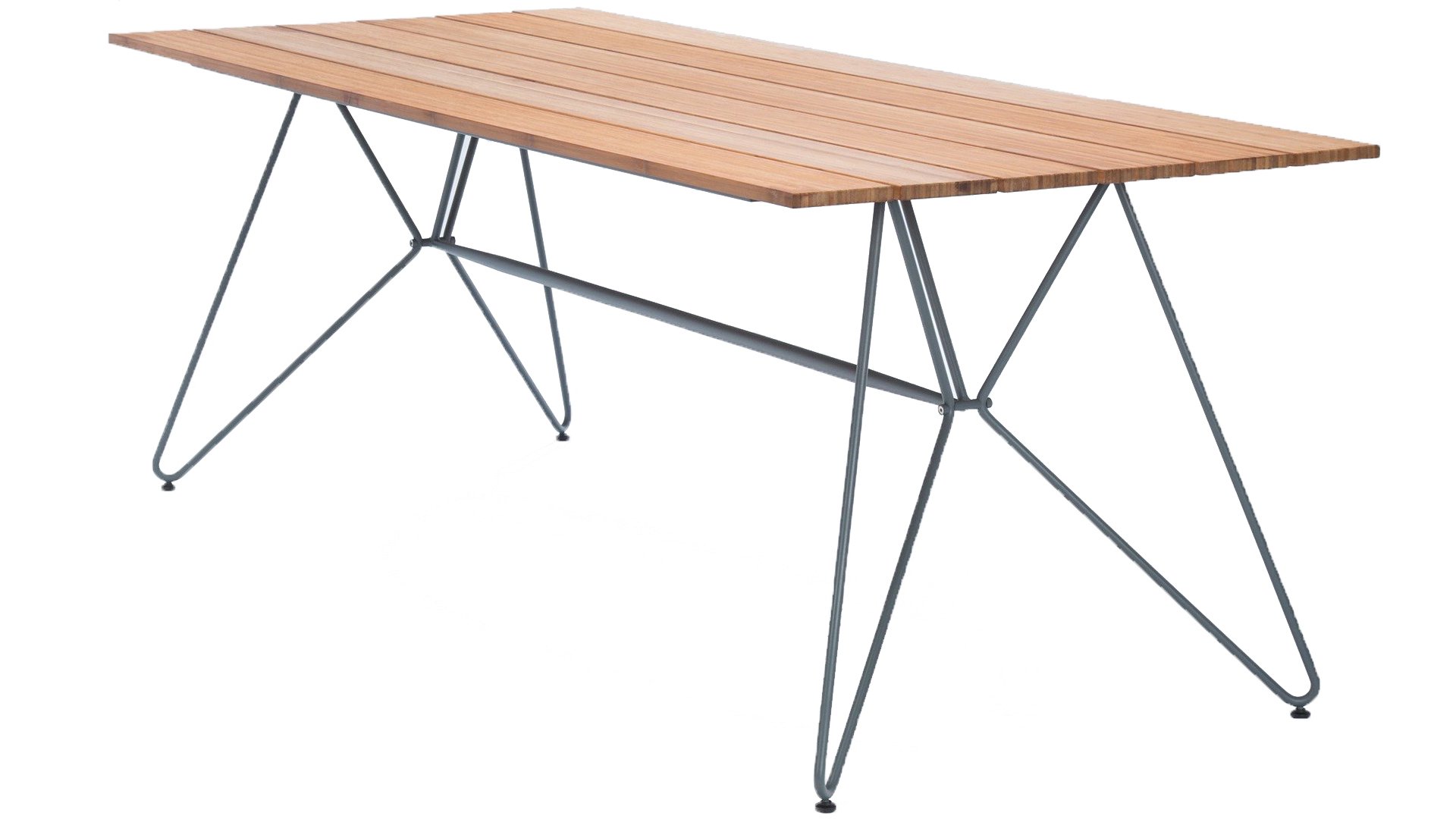 Houe sketch garden table with a bamboo top. This beautiful minimalist garden table from the Danish design brand Houe comes in 2 lengths: 160cm and 220cm. The frame is made of steel combined with a special powder coating, making the table suitable for outdoor placement. This table pairs perfectly with the Click dining garden chairs from Houe, the frame is the same color as the frame of the chairs. Because bamboo grows much faster, it is a sustainable alternative to teak wood. Bamboo needs to be oiled 2-3 times a year to maintain its beautiful warm color.