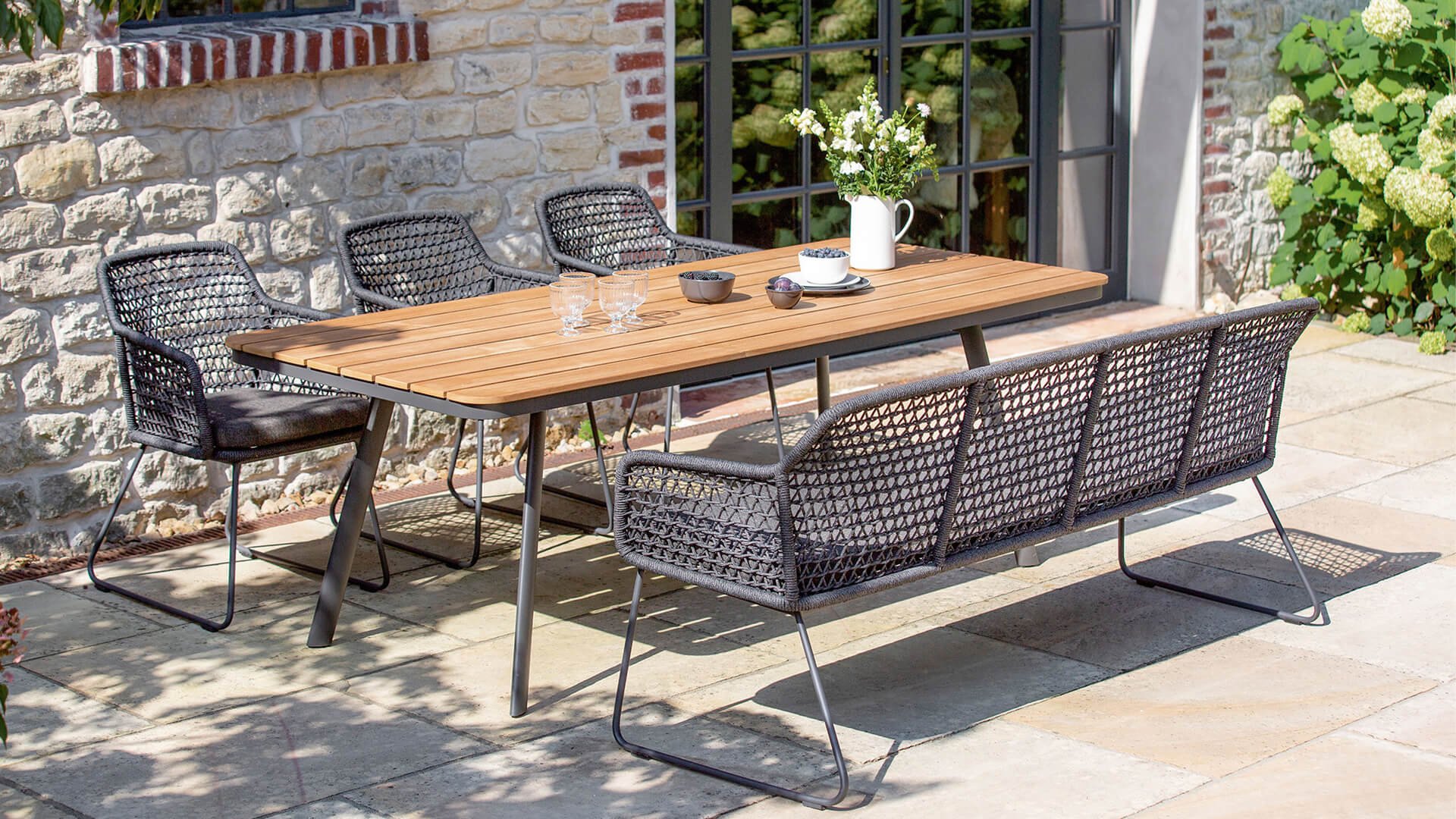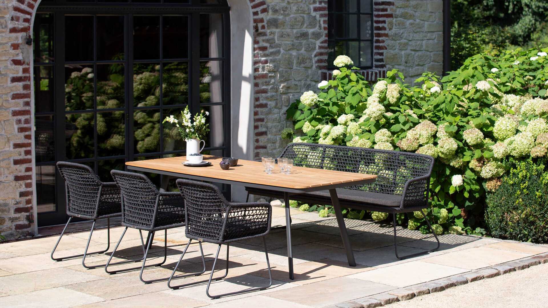 The Niehoff Kubu frame is woven with synthetic wicker in the form of rope. The cushions are made of beautiful Southend Anthracite fabric. The resilience of the Rope material and the comfortable seat and back cushions provide sublime seating comfort! This fabric is highly weather resistant and durable. The Niehoff KUBU bench is a modern bench. The rounded aluminum frame of the backrest and armrests is covered with beautifully braided cords in a diamond pattern.