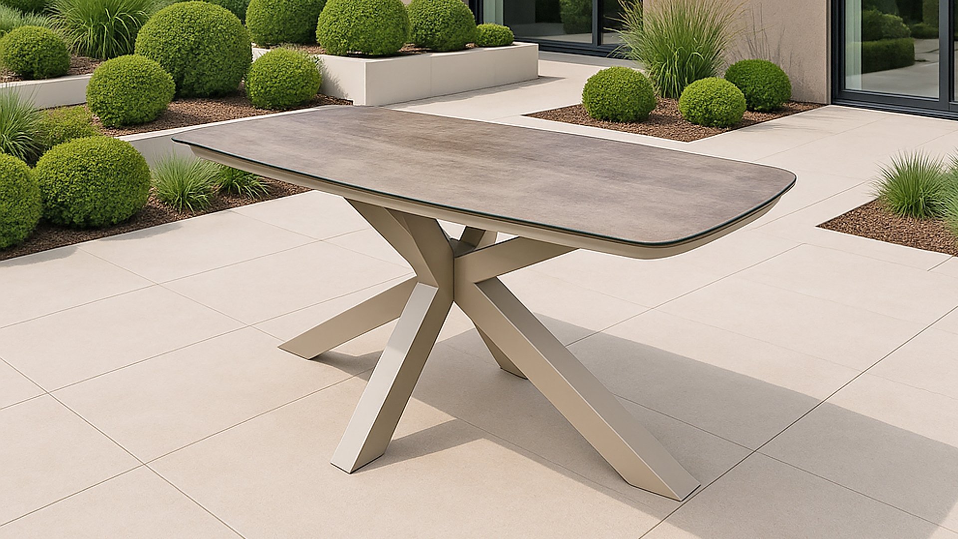 The Valerie 220cm. Crafted from powder-coated aluminum in a taupe finish and featuring an 8mm ceramic-on-glass tabletop, it's virtually maintenance-free. This beautiful table combines functionality with a stylish design, making it the ideal choice for anyone who enjoys outdoor living.