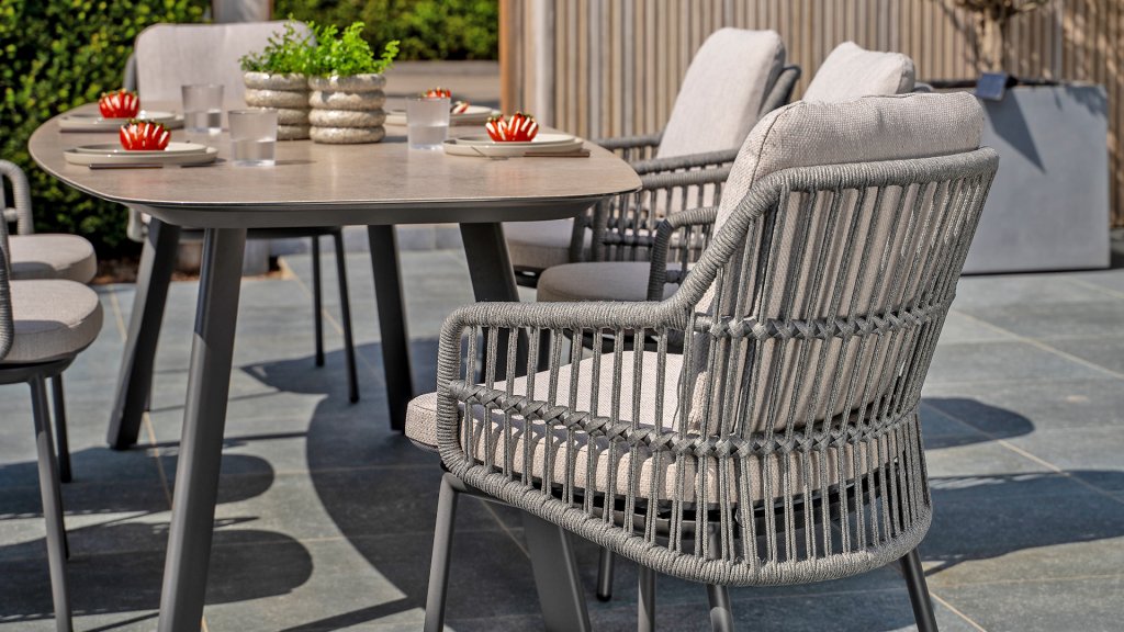 The beautifully shaped curves, durable anthracite powder-coated aluminum frame, and stylish gray rope weave make the Alicante chair an elegant and timeless choice for any outdoor space. The included light gray cushions provide a luxurious seating experience, whether you're dining or simply relaxing.
