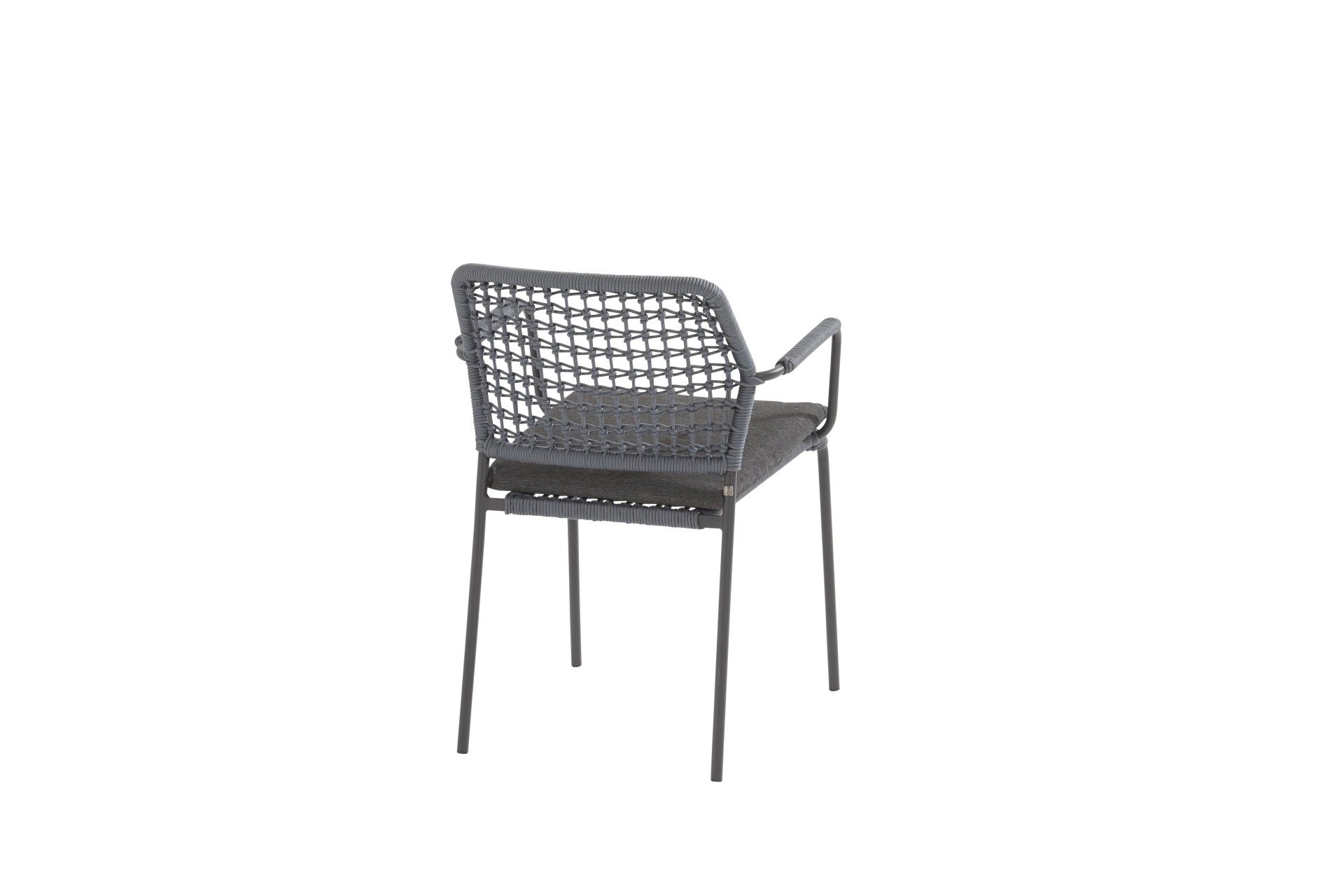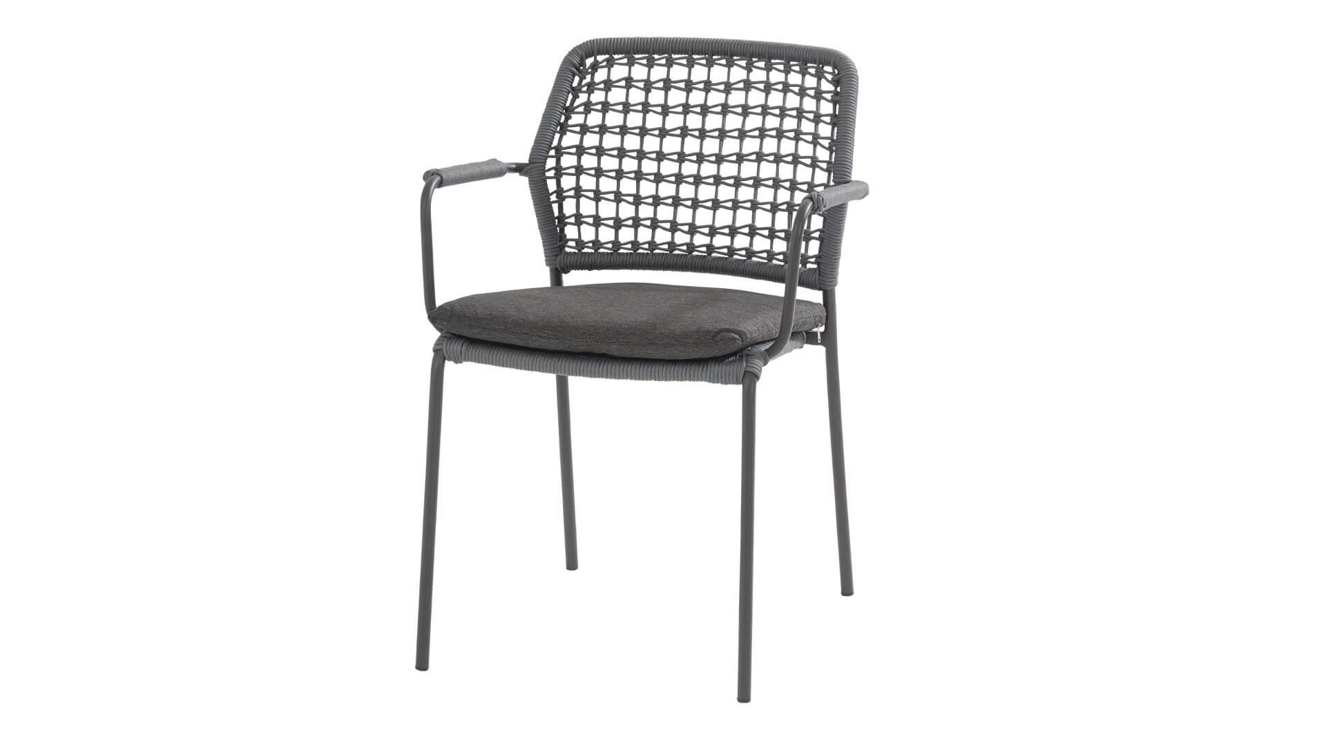 This chair is available in 5 rope colors: Anthracite, Green, Blue, Frozen, and Latte. You are looking at the anthracite variant. You can choose which color best fits your terrace, or create a beautiful combination of 2 or even 5 colors. The rope material is weather-resistant and knotted in a block pattern. The rope subtly reappears in the armrests.