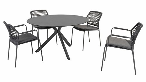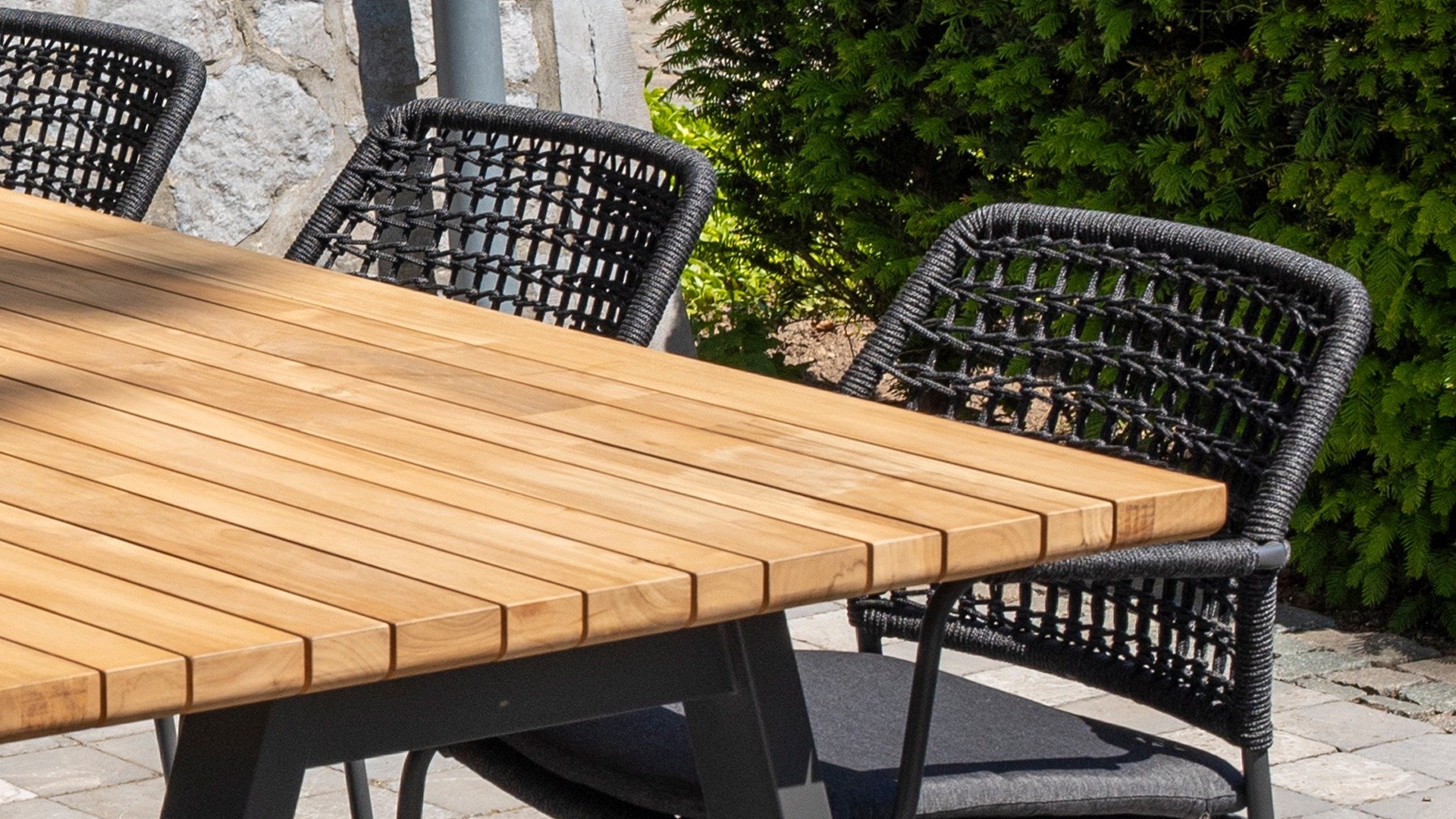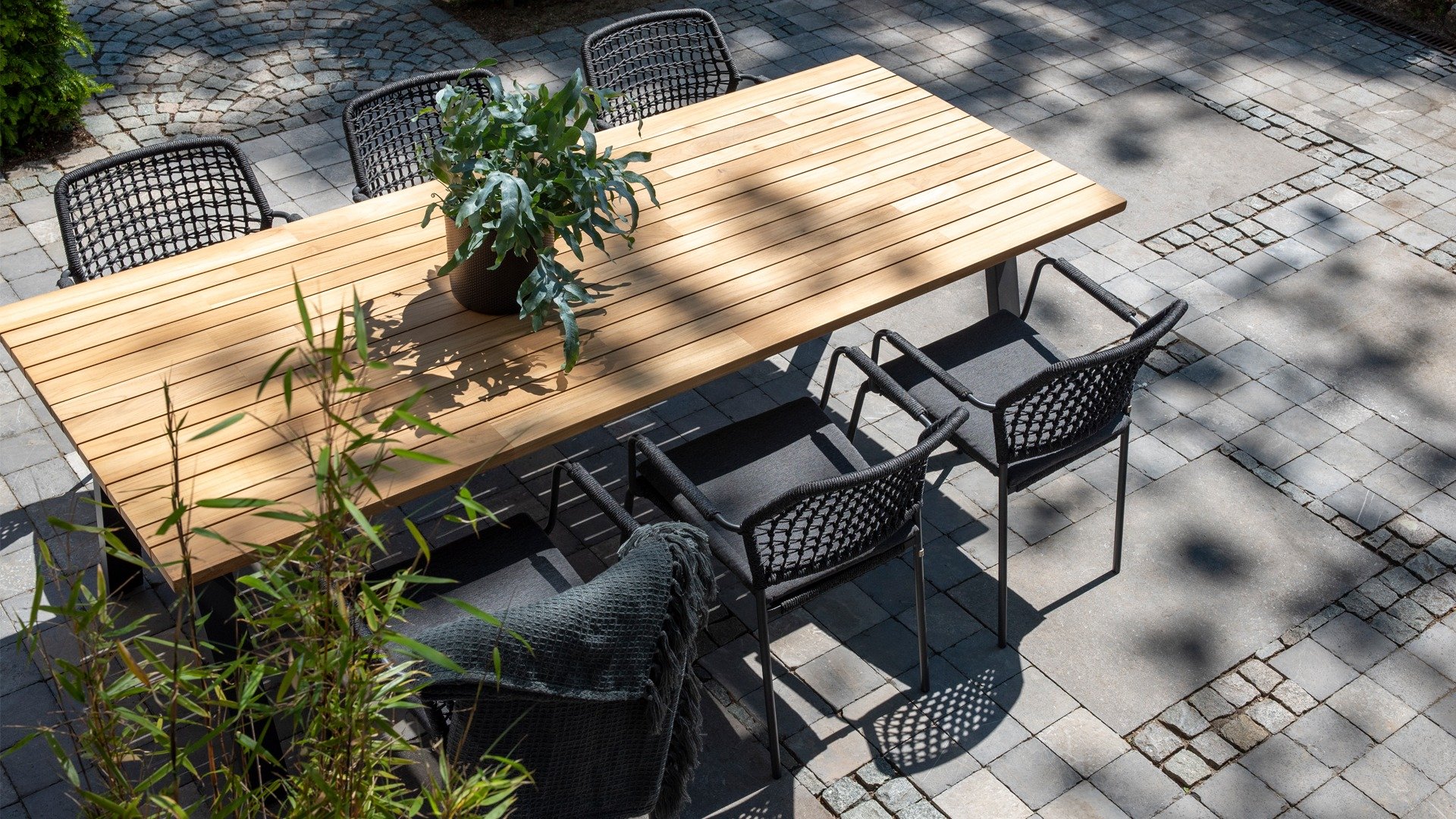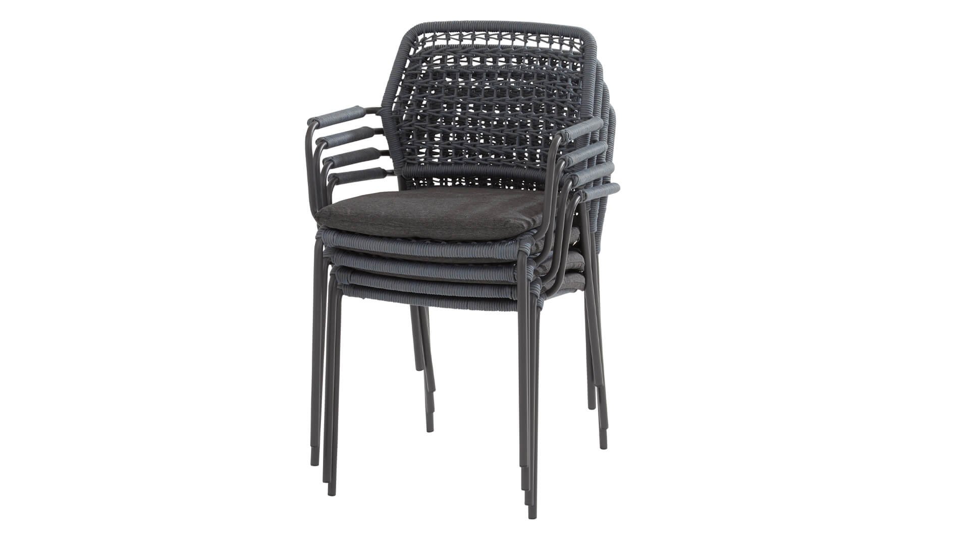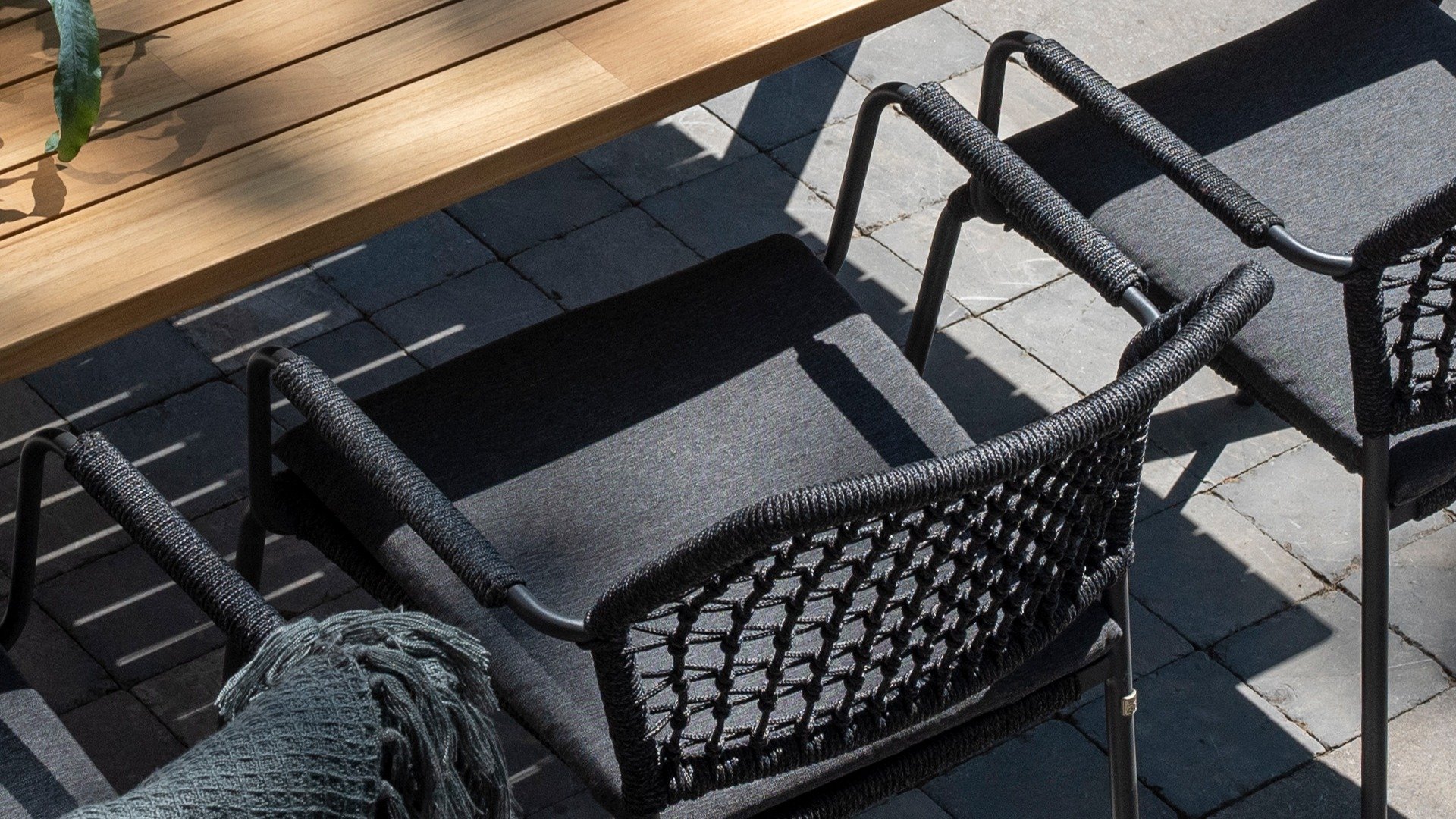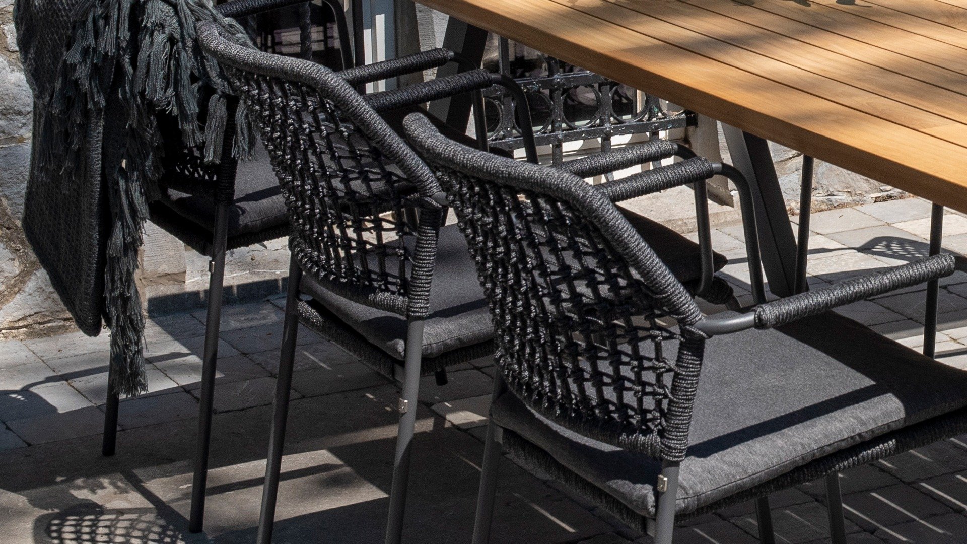 This chair is available in three colors: Anthracite, Terre, and Latte. The rope material is weather-resistant and knotted in a checkered pattern, which is subtly echoed in the armrests.