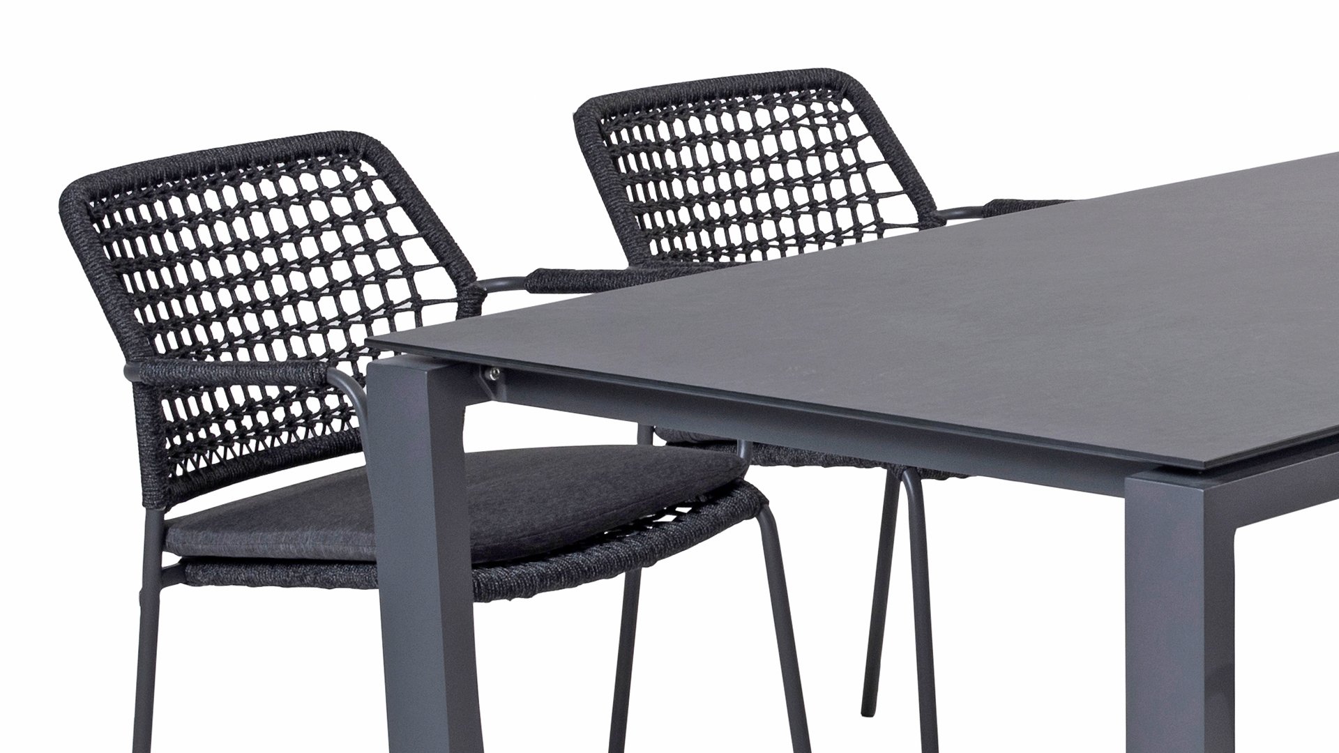 This chair is available in three colors: Anthracite, Terre, and Latte. The rope material is weather-resistant and knotted in a checkered pattern, which is subtly echoed in the armrests.