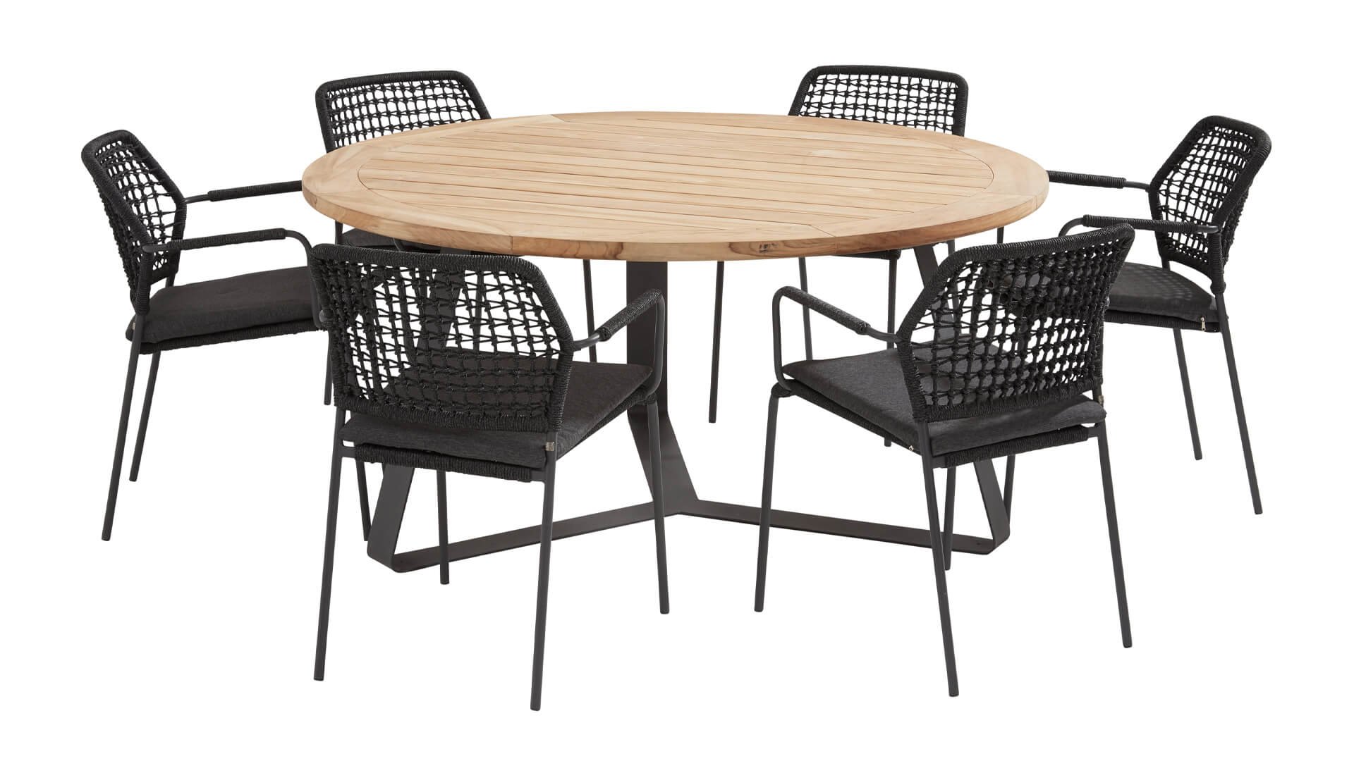 This chair is available in three colors: Anthracite, Terre, and Latte. The rope material is weather-resistant and knotted in a checkered pattern, which is subtly echoed in the armrests.