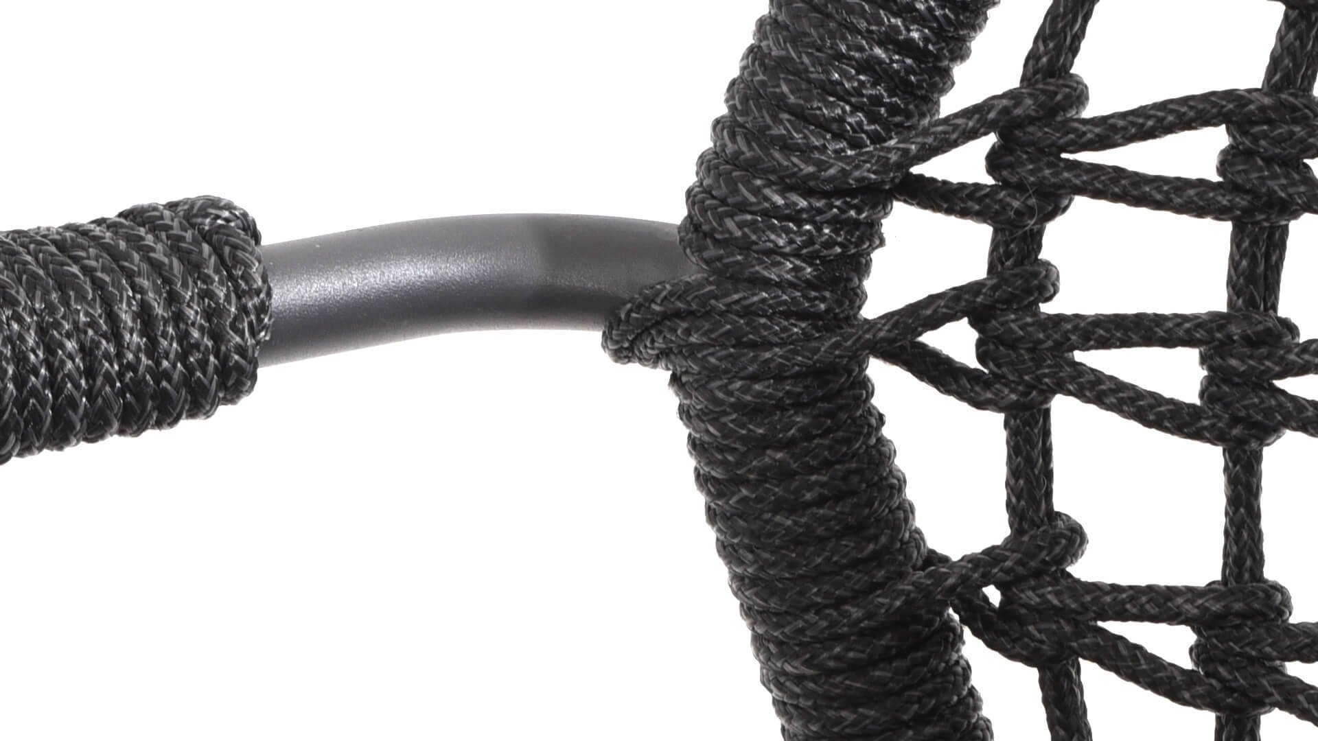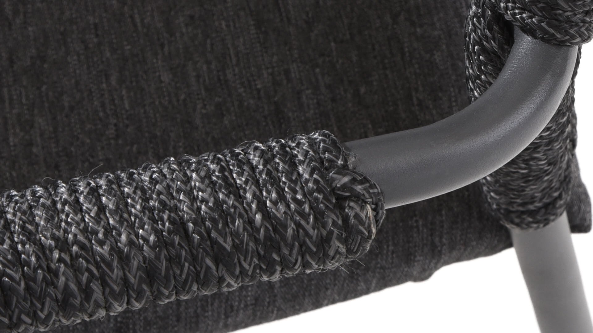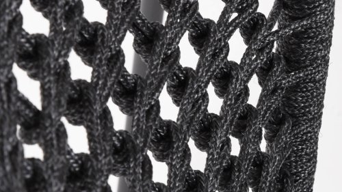 This chair is available in three colors: Anthracite, Terre, and Latte. The rope material is weather-resistant and knotted in a checkered pattern, which is subtly echoed in the armrests.