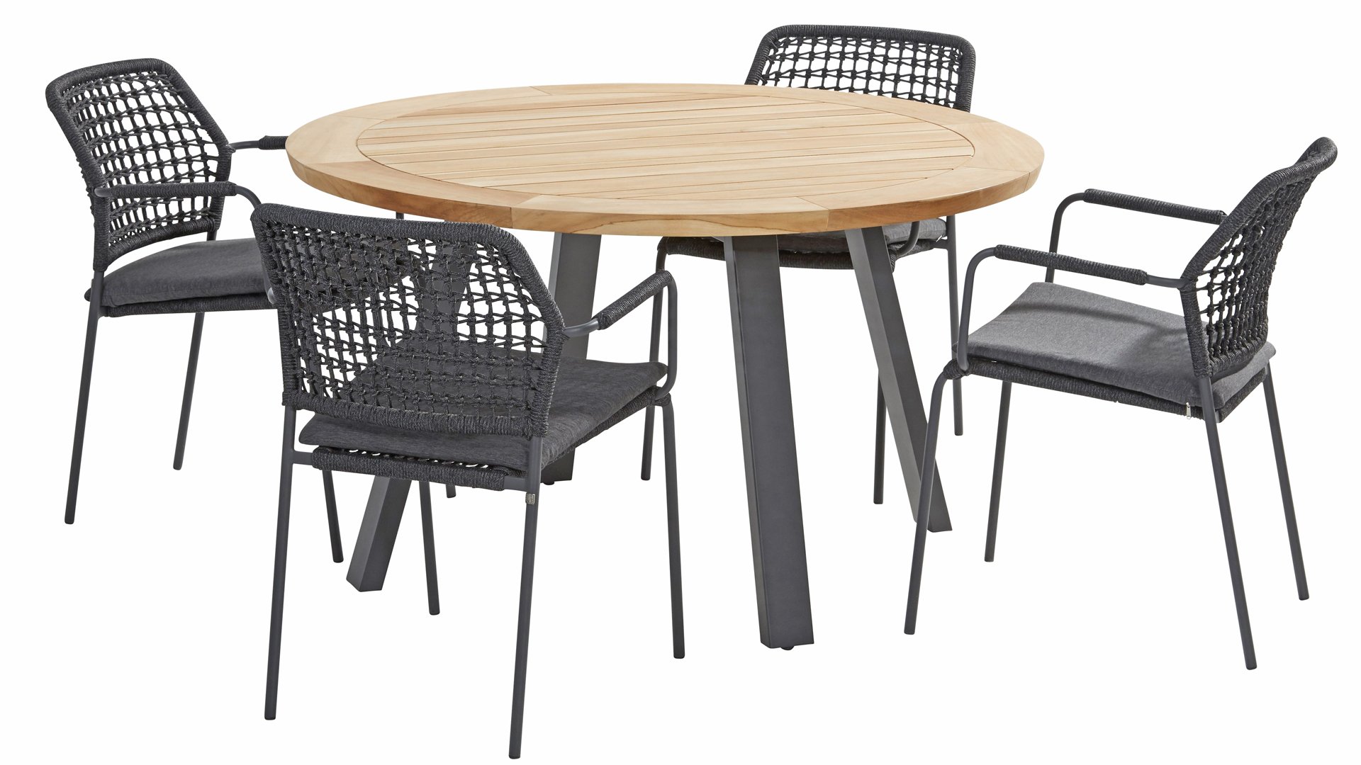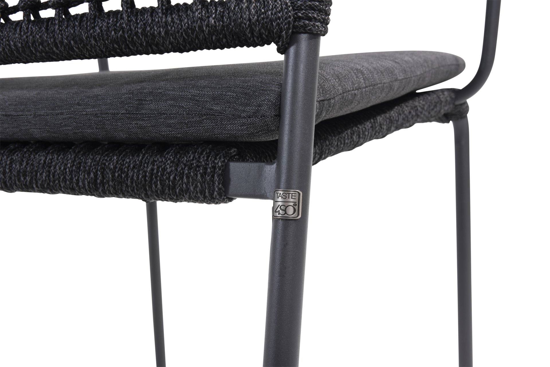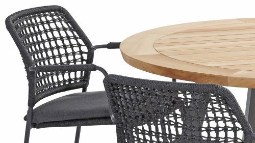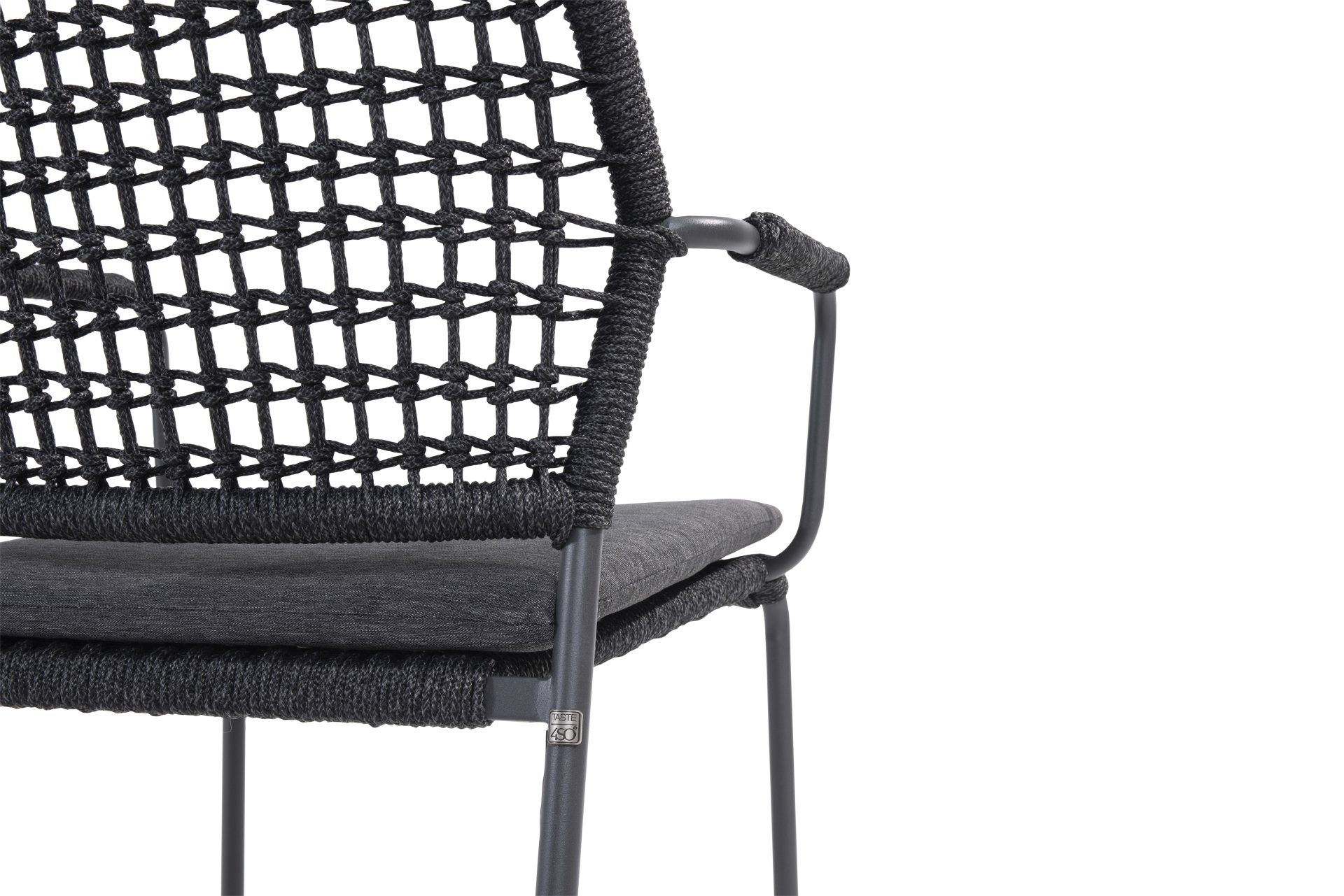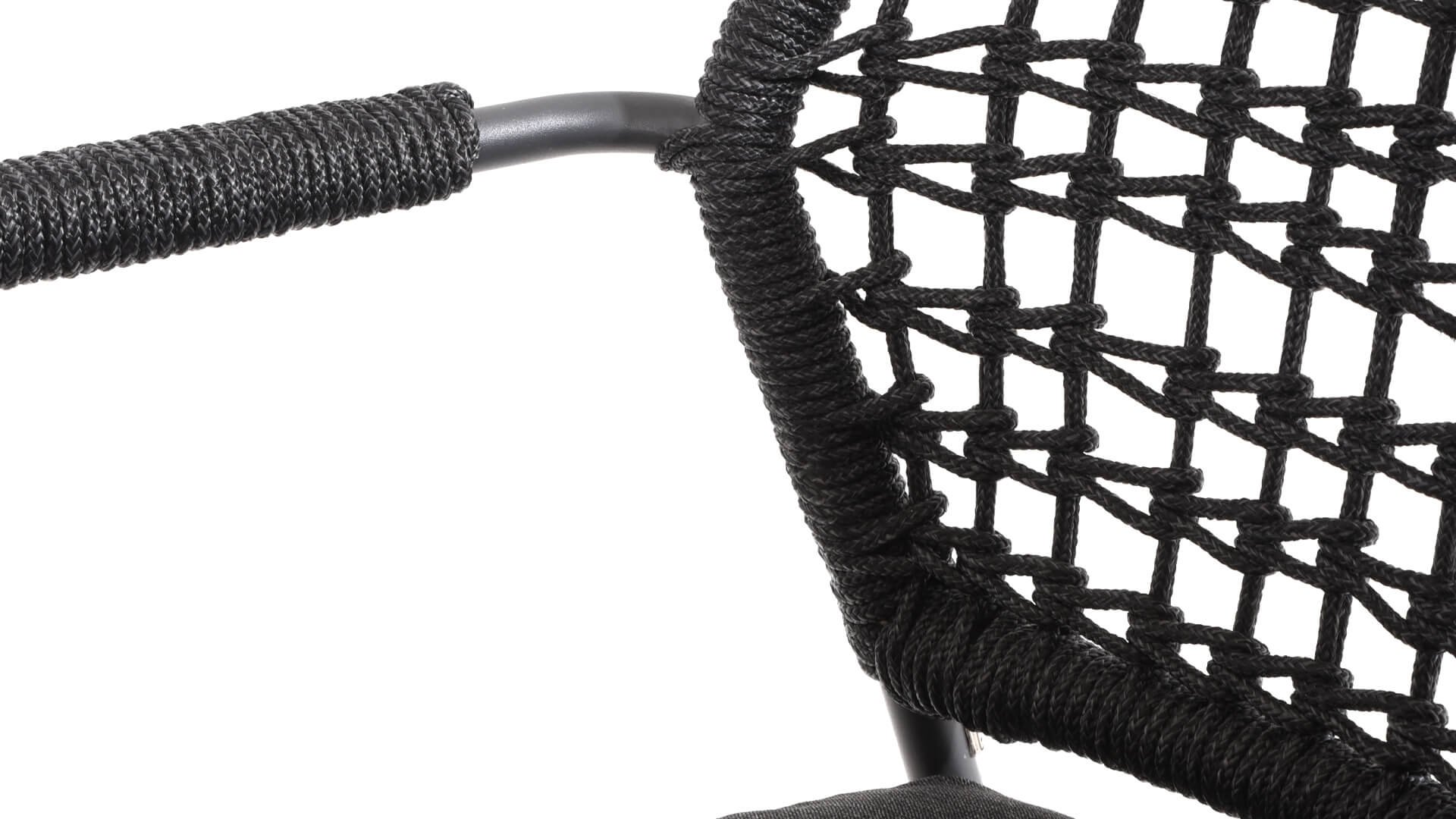 This chair is available in three colors: Anthracite, Terre, and Latte. The rope material is weather-resistant and knotted in a checkered pattern, which is subtly echoed in the armrests.