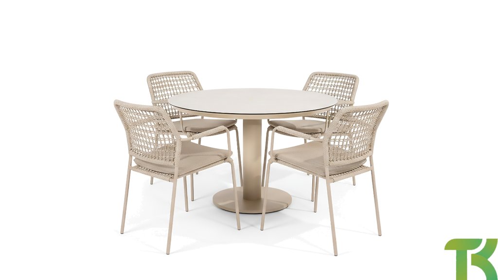 Meet the Taste Sarah, the round table that effortlessly combines elegance and functionality. This beautiful table is a real eye-catcher in any garden or dining area. Its round design creates a cozy, inviting atmosphere where everyone at the table stays connected. The high-quality printed ceramic top not only creates a luxurious look but is also exceptionally strong, scratch-resistant, and easy to maintain. The central leg offers maximum legroom and gives the table a modern, airy look. The Taste by 4 Seasons Outdoor Sarah is available in two versions and two colors. The table is available in two sizes: 120x75cm (dining) and 130x69cm (low dining), in the colors Latte and Terre.
