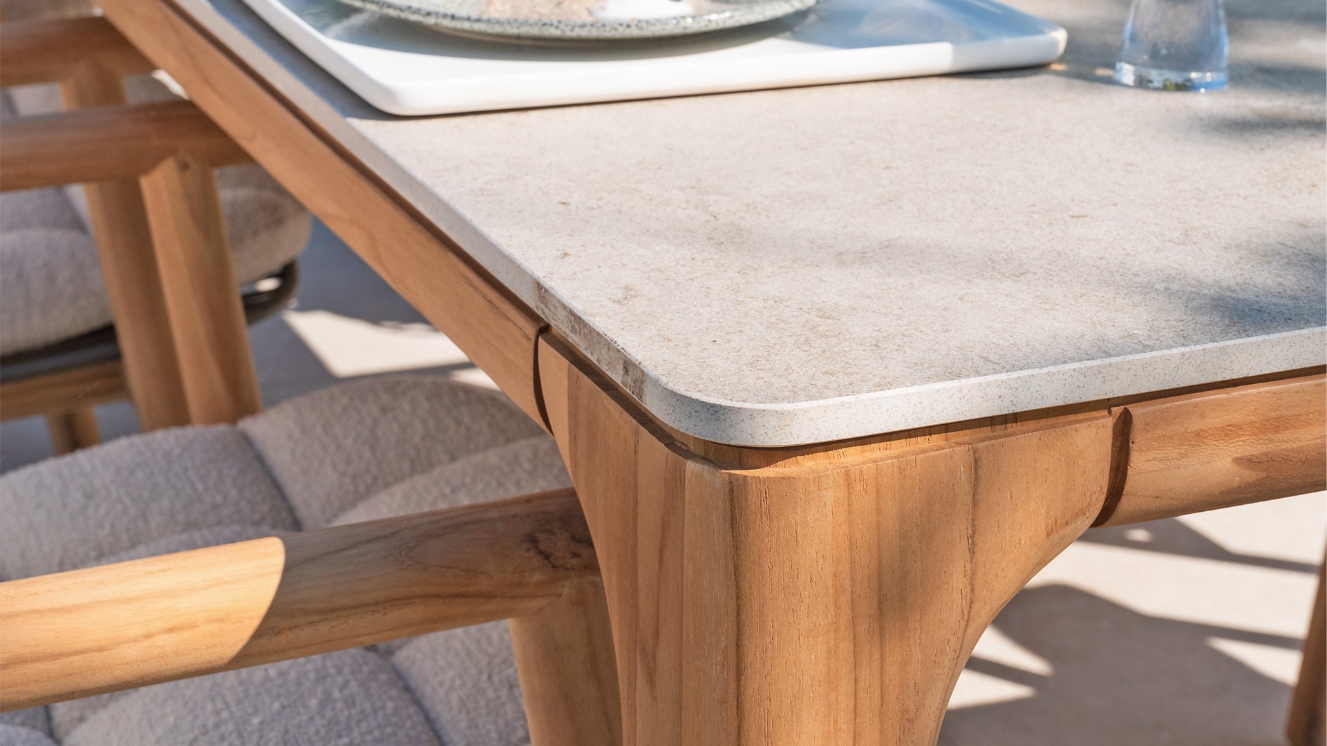 The Liam 240cm Ceramic is a beautiful addition to any dining space, with a generous size of 240x100x75 cm. The teak frame provides a warm, natural look and ensures stability and durability. Teak is perfect for long-term use and withstands various weather conditions well, making the table suitable for both indoor and outdoor applications. The ceramic top adds a contemporary touch and is easy to maintain. It is resistant to stains and scratches, making it ideal for daily meals and special occasions. The rectangular shape of the Liam table is characterized by rounded corners and finishes, creating a soft, inviting look. This design makes the table not only practical but also stylish, fitting perfectly into various interior styles, from modern to rustic. The Liam is available in solid teak or ceramic-teak: