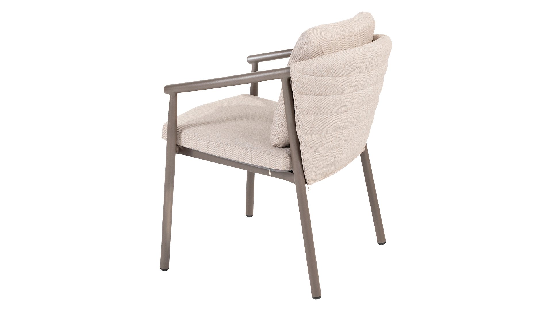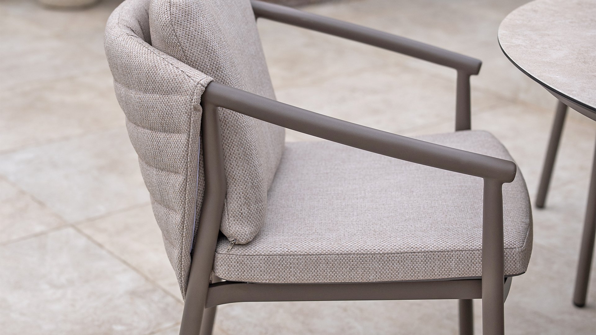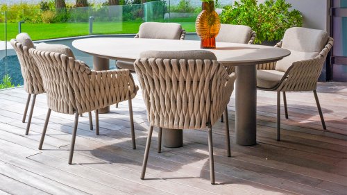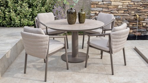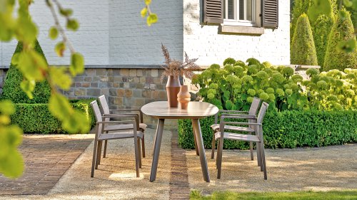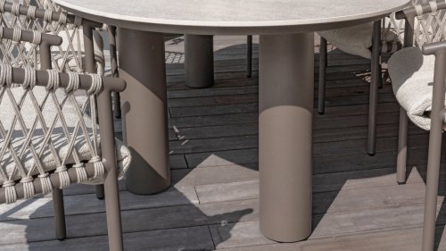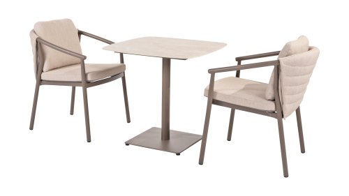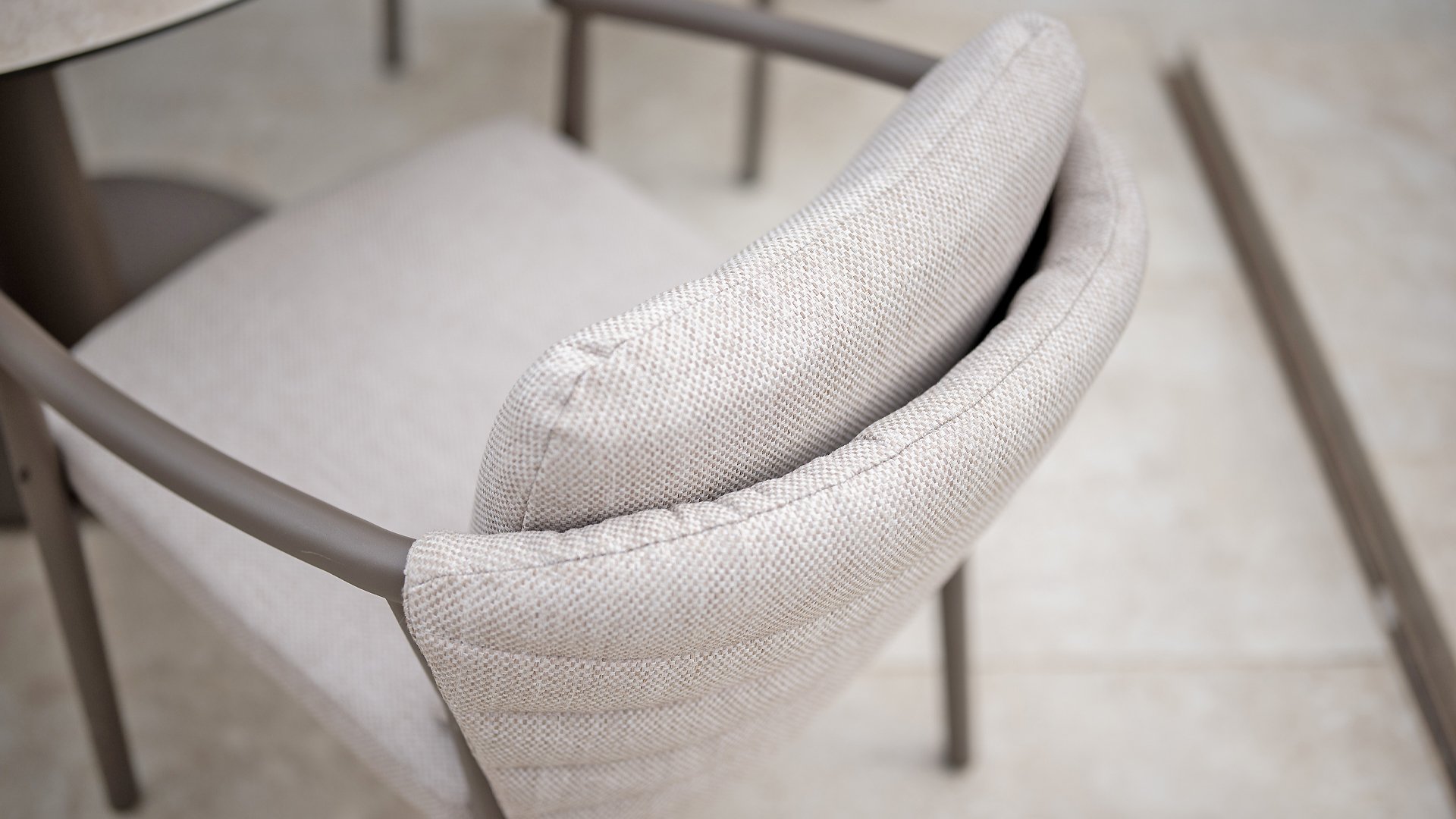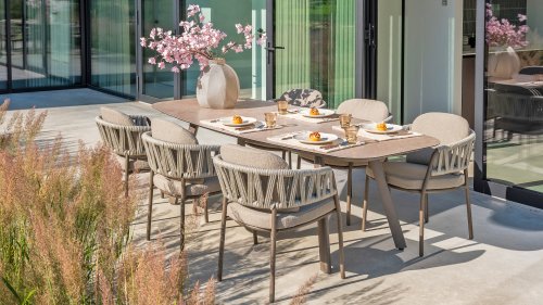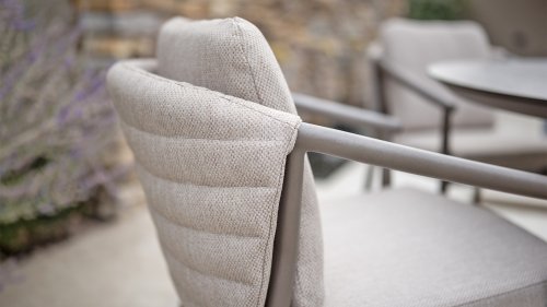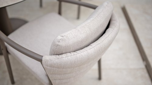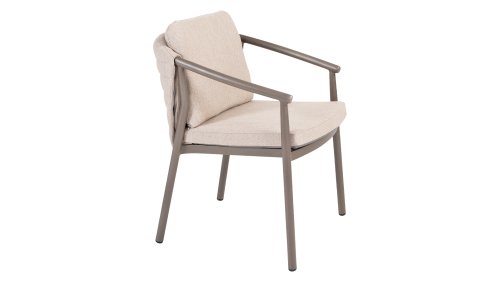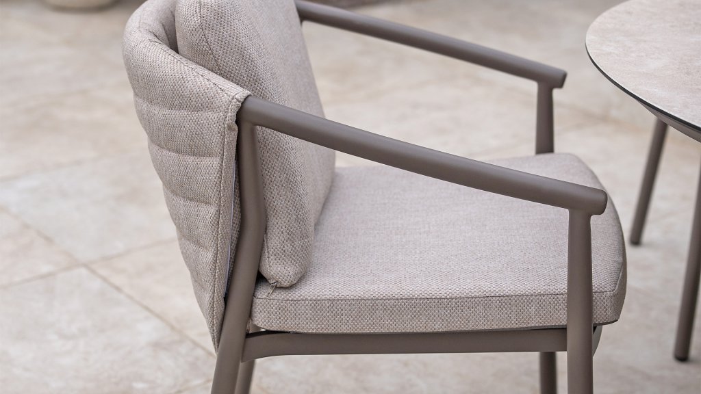 The Taste 4SO Barolo is unique. The quilted fabric backrest distinguishes the chair and provides wonderfully soft comfort. Combined with the elegant Terre powder-coated aluminum frame and the stylish gray rope that embraces the cushions, the chair creates a serene and stylish look that perfectly complements any modern garden. The light gray cushions complete the look and invite you to enjoy long, cozy evenings outdoors. In addition to the garden set, a lounge set is also available within this series to complete the outdoor experience.