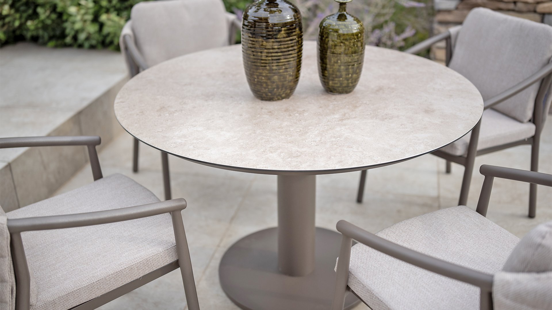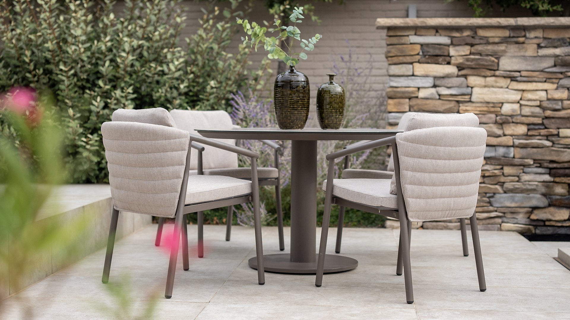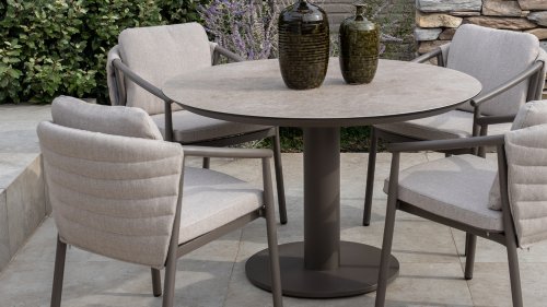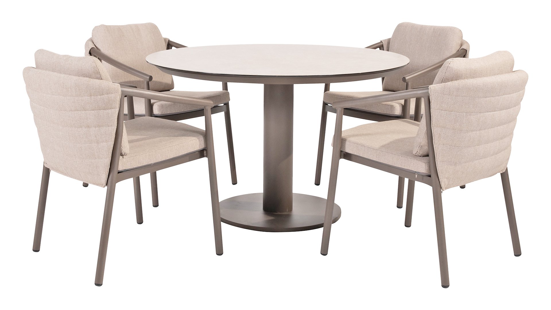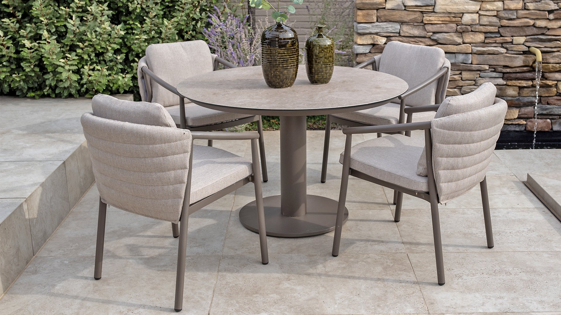 The Taste 4SO Barolo is unique. The quilted fabric backrest distinguishes the chair and provides wonderfully soft comfort. Combined with the elegant Terre powder-coated aluminum frame and the stylish gray rope that embraces the cushions, the chair creates a serene and stylish look that perfectly complements any modern garden. The light gray cushions complete the look and invite you to enjoy long, cozy evenings outdoors. In addition to the garden set, a lounge set is also available within this series to complete the outdoor experience.