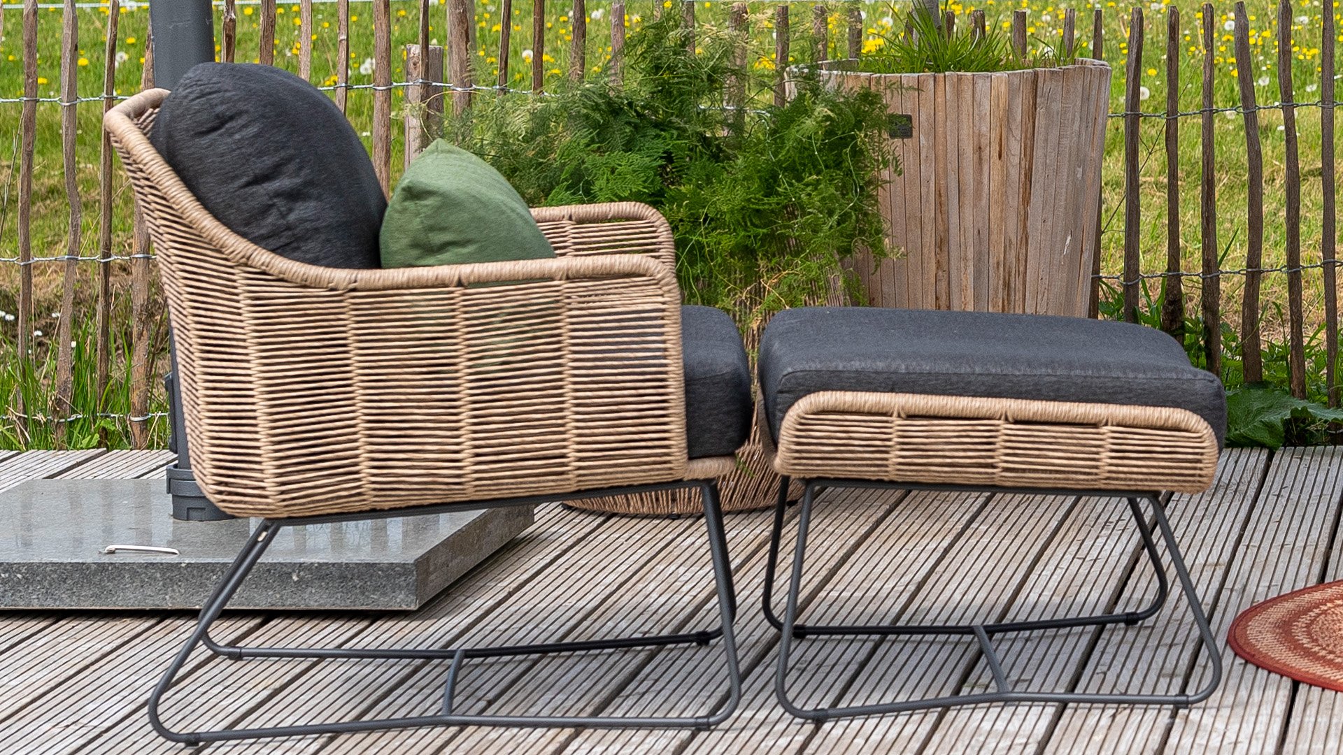 You probably still remember the rattan furniture from the past, who didn't have them in the garden or at home. 4 Seasons Outdoor looks back at these furniture pieces with the Belmond lounge series, which also includes a Belmond lounge sofa. The rattan material from the past has been replaced with weather-resistant wickerwork. The weave wire is so strong and colorfast that it comes with a 5-year warranty. Beautifully woven around the frame, this lounge looks natural but also modern. A modern version of an old tradition. You will also enjoy many lounge seasons with the strong cushions. The cushions are water and dirt-repellent, colorfast, and feel soft due to their unique properties.