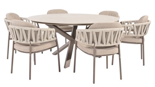 This dining set combines refined style with everyday comfort. The chic terre color adds a cozy and stylish ambiance to your garden, making it the perfect spot for relaxed meals and good conversations. The sleek design fits perfectly into any outdoor space and offers both comfort and charm for any time spent outdoors. This chair is available in two colors: Latte and Terre. It features comfortable, weather-resistant cushions that are both soft to the touch and quick-drying. This means you can enjoy not only the comfort of the chair but also its ease of care. The cushions are included as standard, so you can immediately enjoy ultimate seating comfort. The Calma series also includes two lounge versions, also in the colours Latte and Terre.