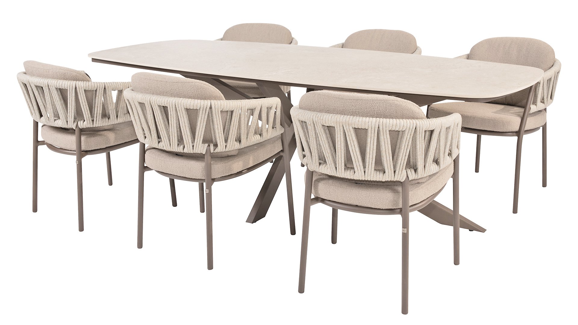 A beautiful, elegant table with a stunning oval ceramic top, available in either 240cm or 300cm. The top not only exudes refinement but also has a striking, modern look. The striking cross leg is available in three colors, allowing you to effortlessly tailor this table to your needs and preferences. Whether you choose industrial black, warm latte, or chic terre, each color adds a unique character and a touch of luxury to the table. With its generous dimensions, this table offers ample space for a cozy meal with friends or an intimate dinner with family. The combination of refined ceramics and the strong, stylish base ensures that this table is not only functional but also makes a stunning statement in your garden.