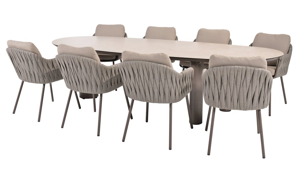 Elegant and modern: the Cannes garden set by Taste by 4 Seasons Outdoor brings a refined sense of tranquility to any outdoor space. The subtle, earth-toned, powder-coated aluminum frame creates a beautiful contrast with the soft gray rope pattern, expertly woven around the chair. The generous Olefin cushions in light gray not only offer ultimate seating comfort but are also weatherproof. This set is designed for long evenings spent dining, relaxed conversations, and atmospheric moments outdoors. With its high-quality materials and luxurious appearance, the Cannes invites you to enjoy it season after season. In addition to the dining version, the Taste 4SO Cannes is also available as a low-dining set, lounge set, and high-dining set, allowing you to furnish your entire garden in the same elegant style.
