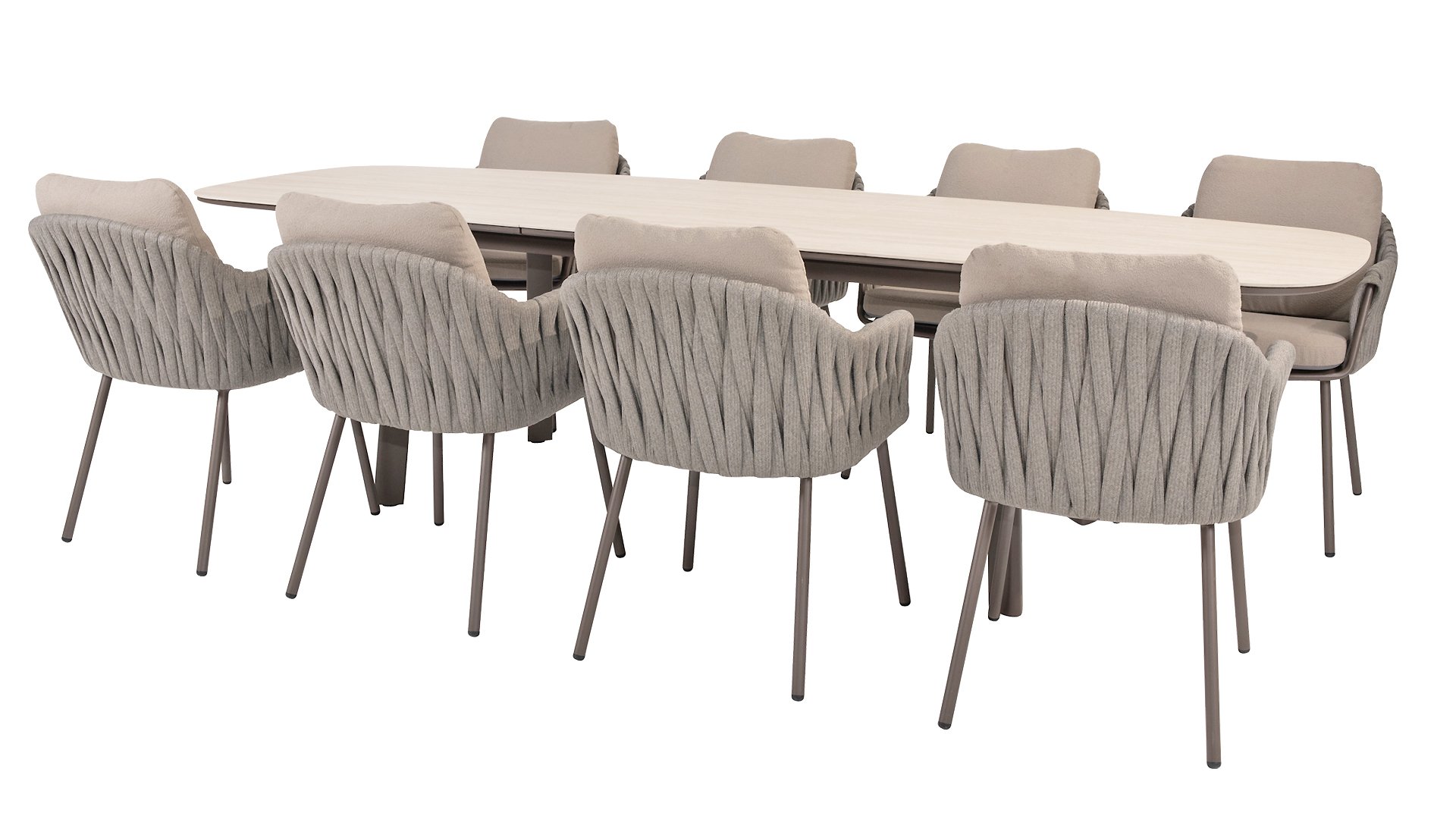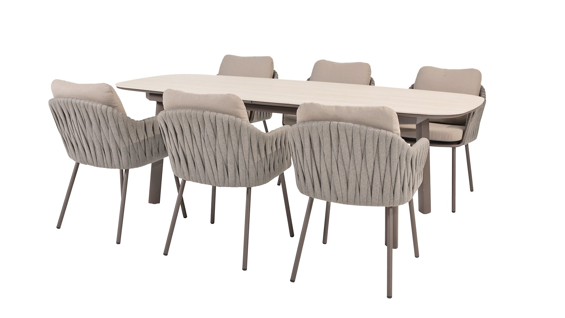 Elegant and modern: the Cannes garden set by Taste by 4 Seasons Outdoor brings a refined sense of tranquility to any outdoor space. The subtle, earth-toned, powder-coated aluminum frame creates a beautiful contrast with the soft gray rope pattern, expertly woven around the chair. The generous Olefin cushions in light gray not only offer ultimate seating comfort but are also weatherproof. This set is designed for long evenings spent dining, relaxed conversations, and atmospheric moments outdoors. With its high-quality materials and luxurious appearance, the Cannes invites you to enjoy it season after season. In addition to the dining version, the Taste 4SO Cannes is also available as a low-dining set, lounge set, and high-dining set, allowing you to furnish your entire garden in the same elegant style.