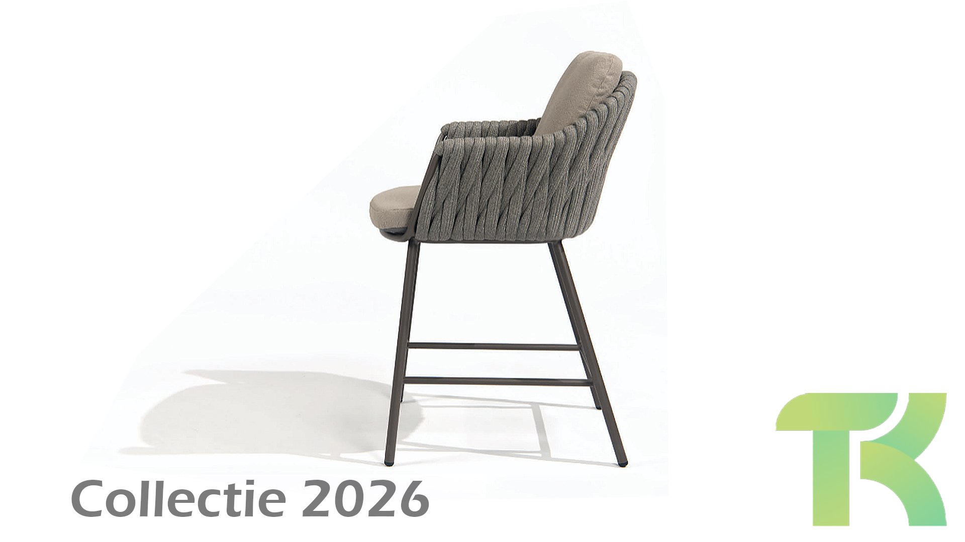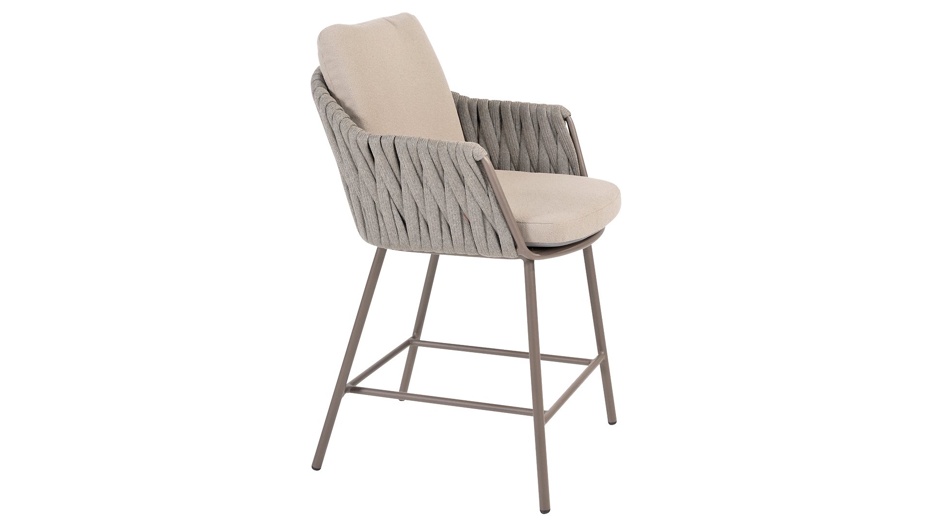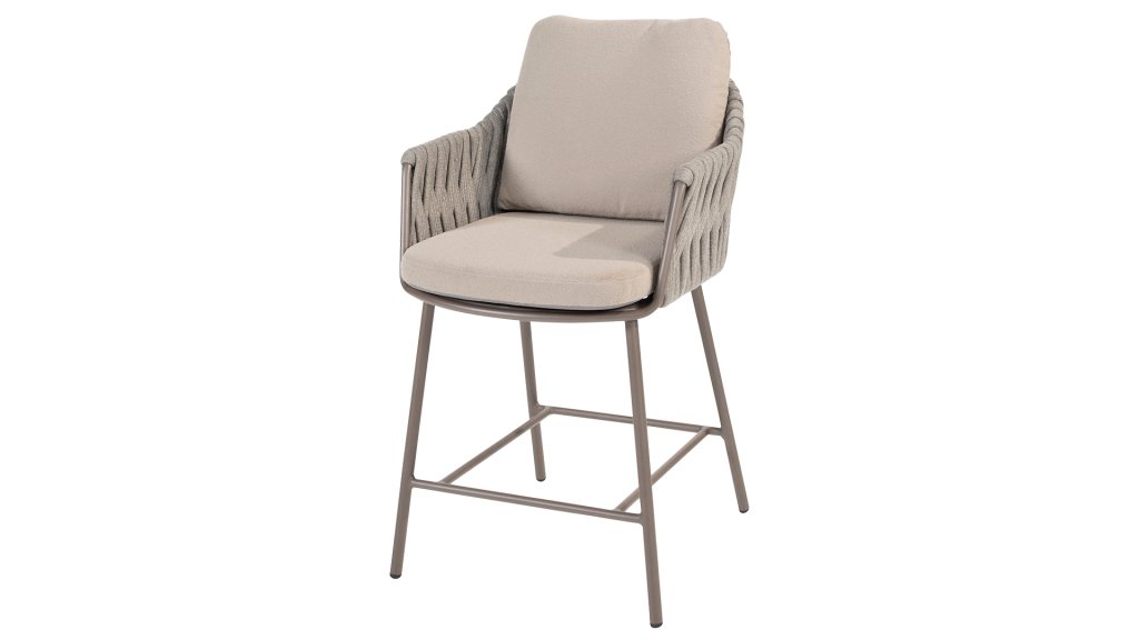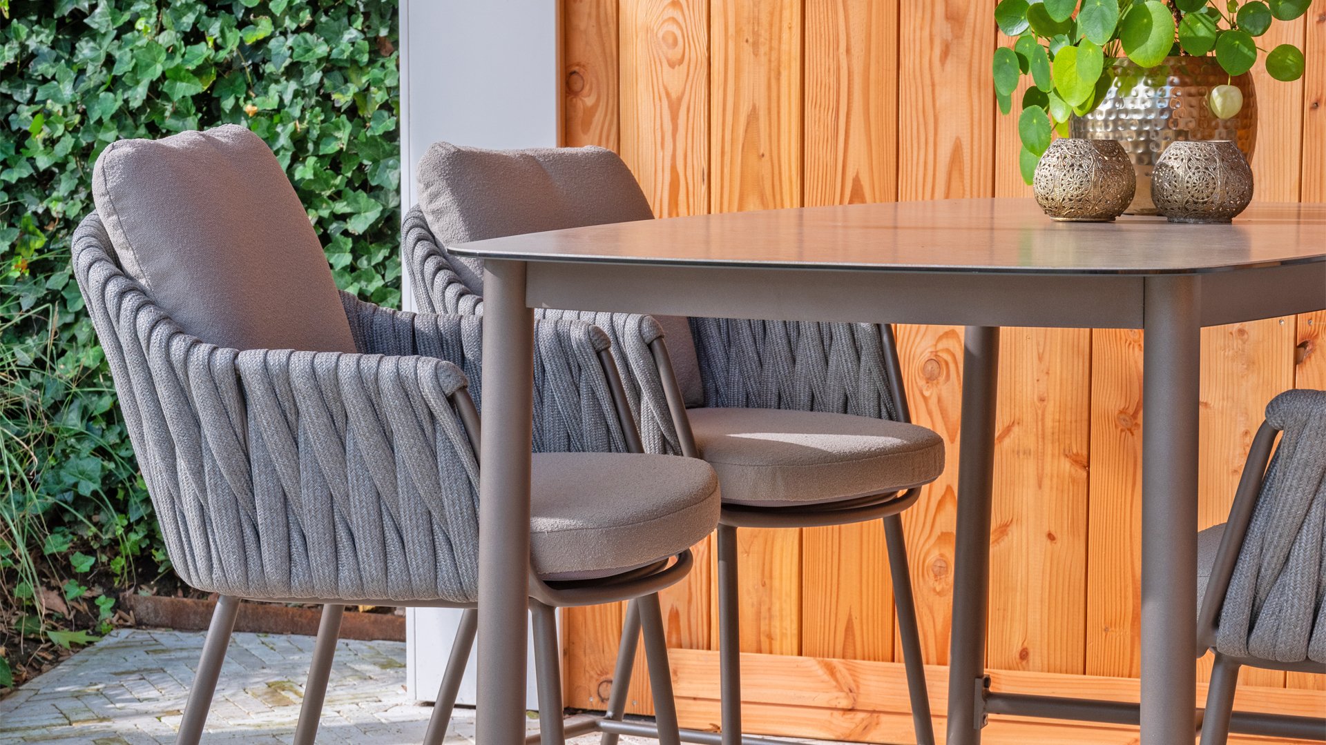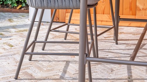 Refined, elevated & distinctive. The Cannes High Dining set by Taste by 4 Seasons Outdoor literally elevates outdoor dining to a higher level. The subtle, terroir-colored, powder-coated aluminum frame creates a beautiful contrast with the elegantly woven, light gray rope. Thanks to the high-quality craftsmanship, the set looks modern, warm, and inviting. The generous Olefin cushions in light gray provide a comfortable, slightly elevated seating position that perfectly complements the luxurious high dining experience.