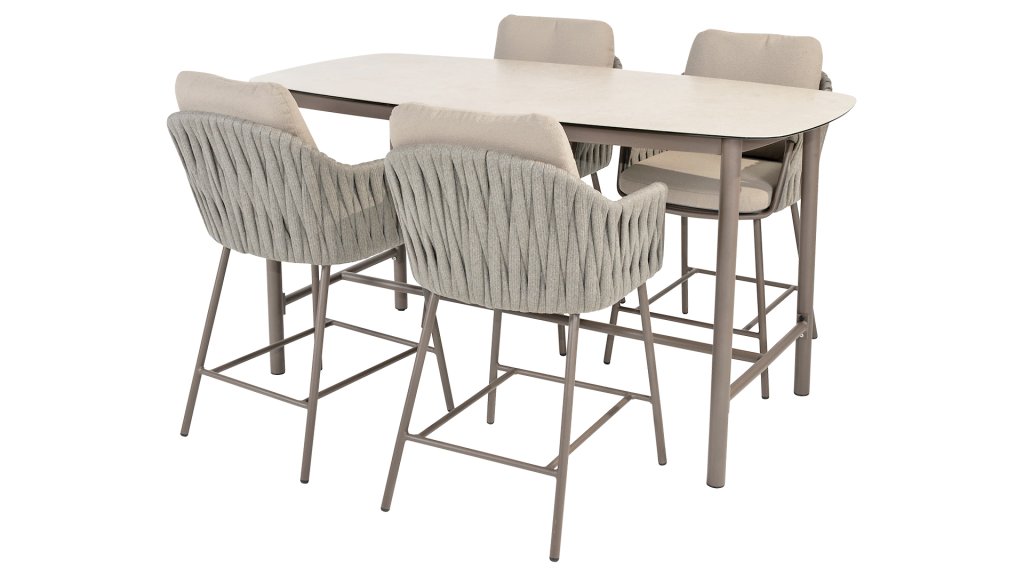 Refined, elevated & distinctive. The Cannes High Dining set by Taste by 4 Seasons Outdoor literally elevates outdoor dining to a higher level. The subtle, terroir-colored, powder-coated aluminum frame creates a beautiful contrast with the elegantly woven, light gray rope. Thanks to the high-quality craftsmanship, the set looks modern, warm, and inviting. The generous Olefin cushions in light gray provide a comfortable, slightly elevated seating position that perfectly complements the luxurious high dining experience. High dining is a higher form of outdoor dining, where the table and chairs exceed standard dining height but are lower than a bar set. It offers an active, comfortable seating position and creates a luxurious, informal atmosphere ideal for drinks and atmospheric dinners. With the Cannes, you can enjoy both style and functionality season after season. In addition to high dining, the Taste 4Seasons Cannes is also available as a dining, low dining, and lounge set.