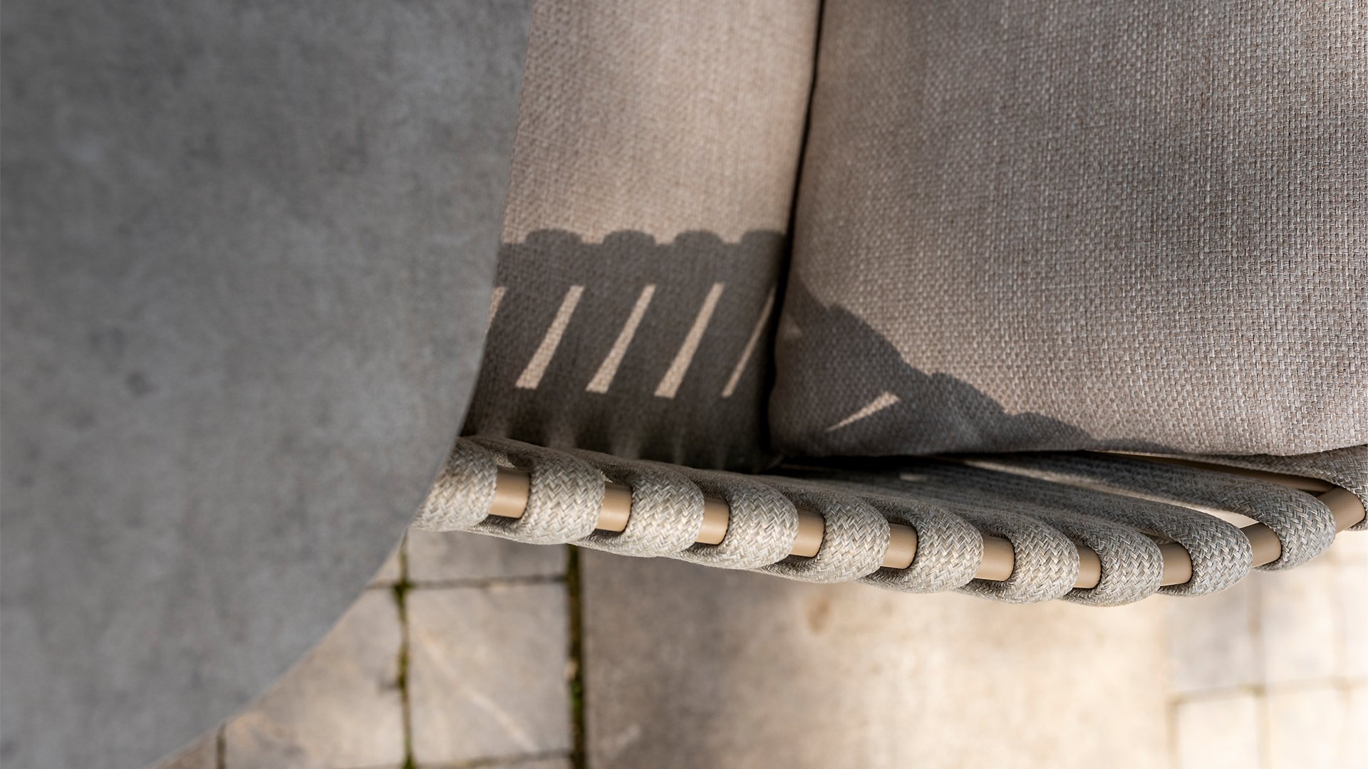 This beautiful material is perfect for outdoor use, because Taste Rope isn't just any shoelace. Taste uses very high-quality rope made from 100% SDP (Solution Dyed Polypropylene). This material is extremely strong and has very little stretch. Polypropylene is oil-based, so dirt and contaminants are virtually insoluble, just like our cushions. Taste offers exclusive designs using hand-woven rope patterns and techniques.