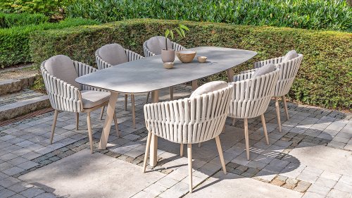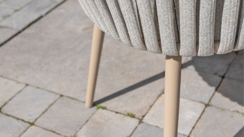 Passion for Eva Designed with attention to detail. The thick, soft rope bands follow the beautiful organic shape of the frame. Add to that the wonderfully comfortable cushions and you'll understand why we are enthusiastic about the Taste by 4 Seasons Outdoor Eva lounge & one dining set. The Taste 4SO Eva dining chair has a modern appearance. The chair comes with soft cushions and features a contemporary aluminum frame with matching latte rope upholstery. The thick rope beautifully complements the latte frame and, together with the cushions, provides comfortable seating. A color that is best described as tasteful beige.