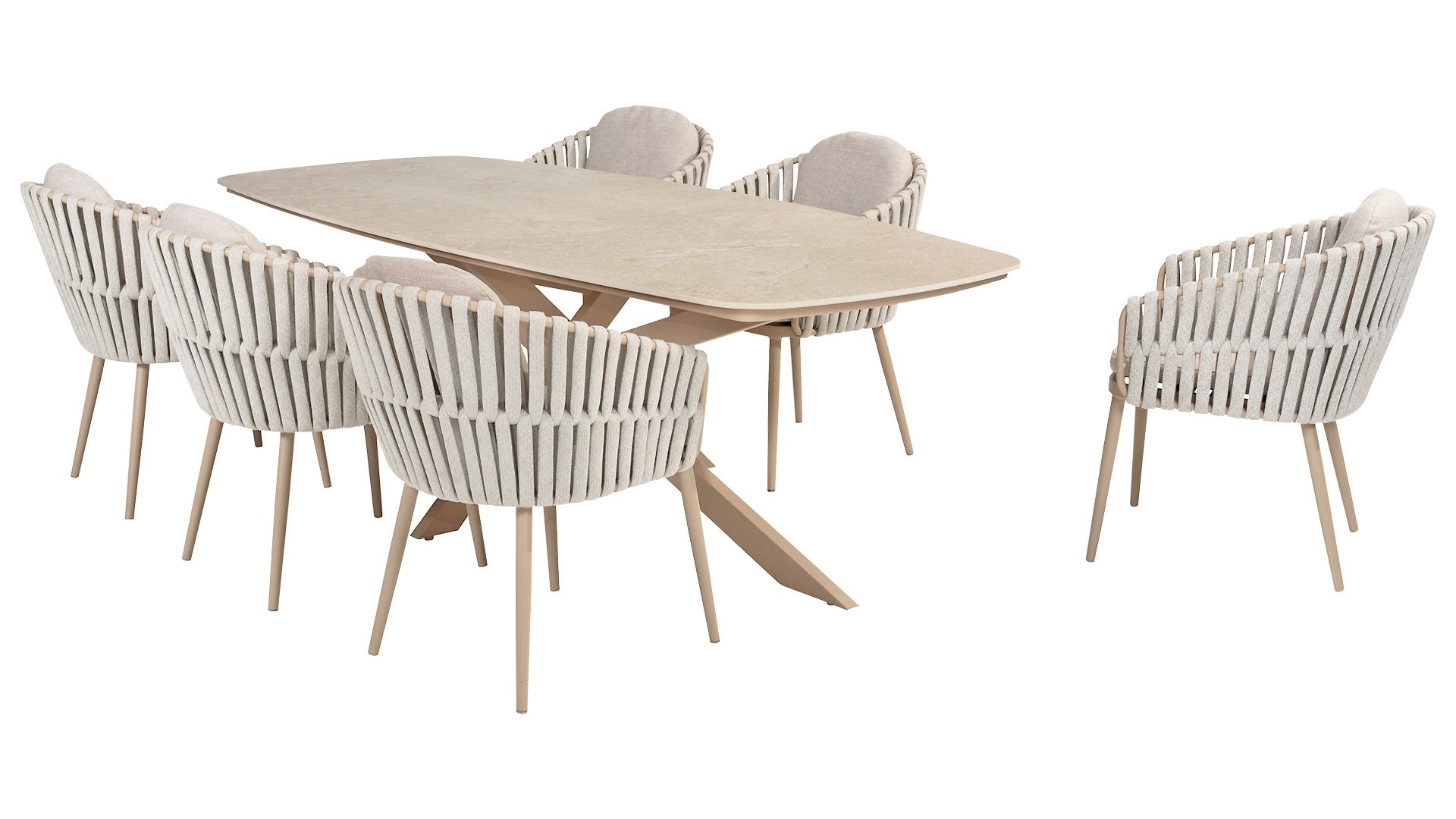 Passion for Eva Designed with attention to detail. The thick, soft rope bands follow the beautiful organic shape of the frame. Add to that the wonderfully comfortable cushions and you'll understand why we are enthusiastic about the Taste by 4 Seasons Outdoor Eva lounge & one dining set. The Taste 4SO Eva dining chair has a modern appearance. The chair comes with soft cushions and features a contemporary aluminum frame with matching latte rope upholstery. The thick rope beautifully complements the latte frame and, together with the cushions, provides comfortable seating. A color that is best described as tasteful beige.