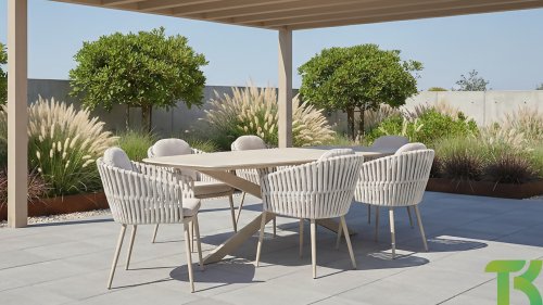 A beautiful, elegant table with a stunning oval ceramic top, available in either 240cm or 300cm. The top not only exudes refinement but also has a striking, modern look. The striking cross leg is available in three colors, allowing you to effortlessly tailor this table to your needs and preferences. Whether you choose industrial black, warm latte, or chic terre, each color adds a unique character and a touch of luxury to the table. With its generous dimensions, this table offers ample space for a cozy meal with friends or an intimate dinner with family. The combination of refined ceramics and the strong, stylish base ensures that this table is not only functional but also makes a stunning statement in your garden.