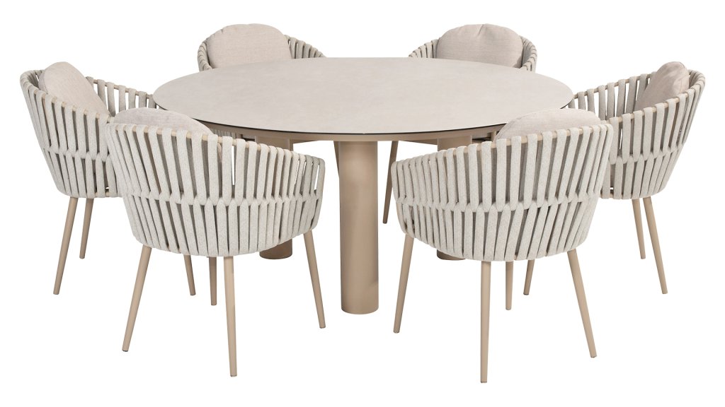 Passion for Eva Designed with attention to detail. The thick, soft rope bands follow the beautiful organic shape of the frame. Add to that the wonderfully comfortable cushions and you'll understand why we are enthusiastic about the Taste by 4 Seasons Outdoor Eva lounge & one dining set. The Taste 4SO Eva dining chair has a modern appearance. The chair comes with soft cushions and features a contemporary aluminum frame with matching latte rope upholstery. The thick rope beautifully complements the latte frame and, together with the cushions, provides comfortable seating. A color that is best described as tasteful beige.