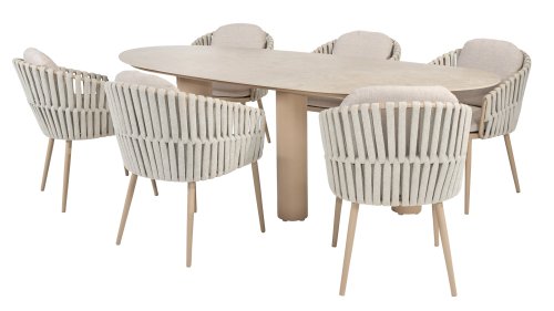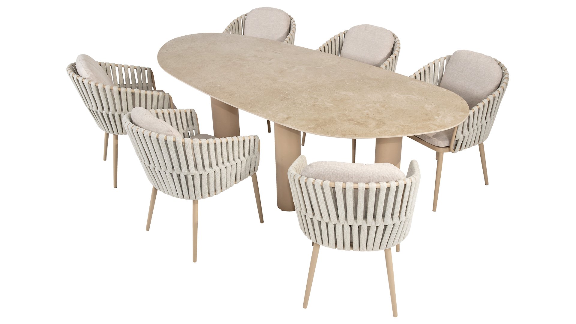 Passion for Eva Designed with attention to detail. The thick, soft rope bands follow the beautiful organic shape of the frame. Add to that the wonderfully comfortable cushions and you'll understand why we are enthusiastic about the Taste by 4 Seasons Outdoor Eva lounge & one dining set. The Taste 4SO Eva dining chair has a modern appearance. The chair comes with soft cushions and features a contemporary aluminum frame with matching latte rope upholstery. The thick rope beautifully complements the latte frame and, together with the cushions, provides comfortable seating. A color that is best described as tasteful beige.