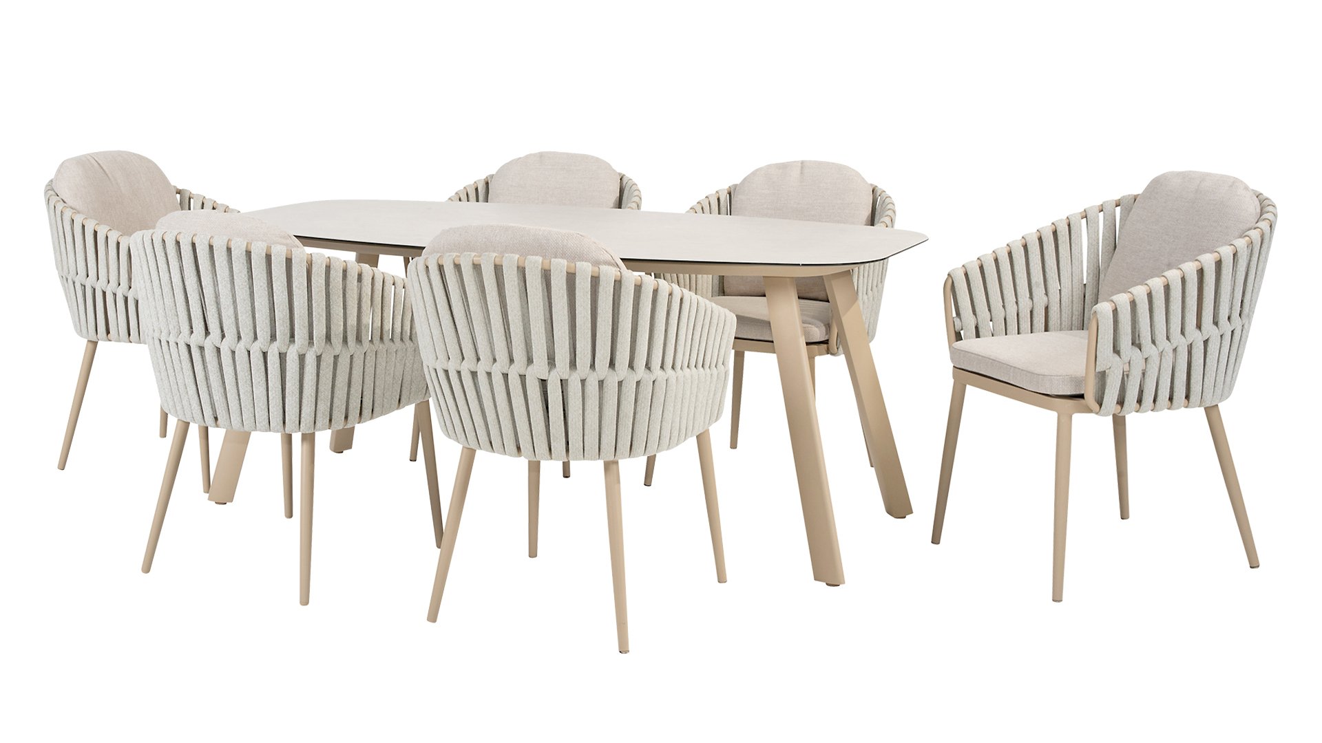 Passion for Eva Designed with attention to detail. The thick, soft rope bands follow the beautiful organic shape of the frame. Add to that the wonderfully comfortable cushions and you'll understand why we are enthusiastic about the Taste by 4 Seasons Outdoor Eva lounge & one dining set. The Taste 4SO Eva dining chair has a modern appearance. The chair comes with soft cushions and features a contemporary aluminum frame with matching latte rope upholstery. The thick rope beautifully complements the latte frame and, together with the cushions, provides comfortable seating. A color that is best described as tasteful beige.