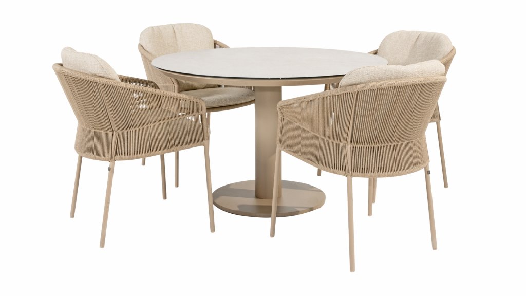 The high-quality printed ceramic top not only creates a luxurious look but is also exceptionally strong, scratch-resistant, and easy to maintain. The central leg offers maximum legroom and gives the table a modern, airy look. The Taste by 4 Seasons Outdoor Sarah is available in two versions and two colors. The table is available in two sizes: 120x75cm (dining) and 130x69cm (low dining), in the colors Latte and Terre. Check them out below: