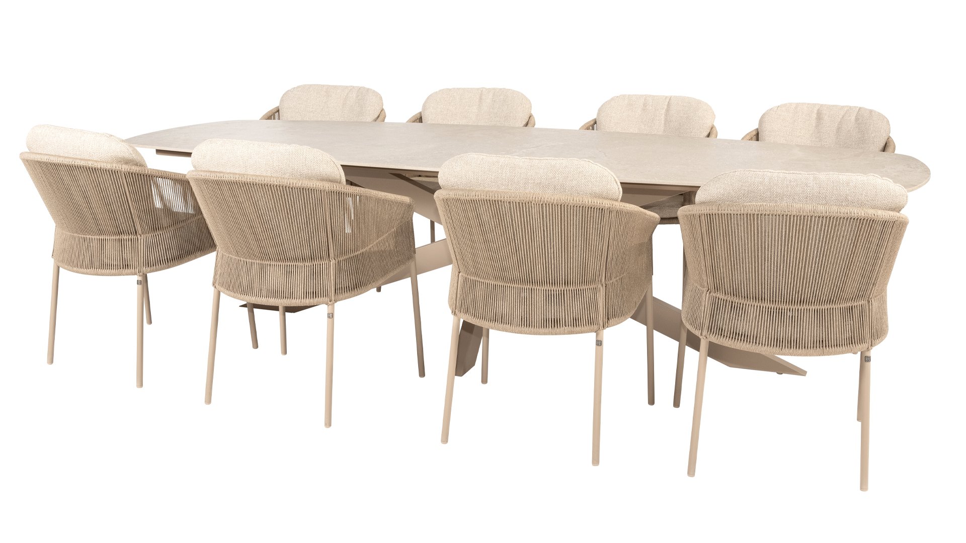 A beautiful, elegant table with a stunning oval ceramic top, available in either 240cm or 300cm. The top not only exudes refinement but also has a striking, modern look. The striking cross leg is available in three colors, allowing you to effortlessly tailor this table to your needs and preferences. Whether you choose industrial black, warm latte, or chic terre, each color adds a unique character and a touch of luxury to the table. With its generous dimensions, this table offers ample space for a cozy meal with friends or an intimate dinner with family. The combination of refined ceramics and the strong, stylish base ensures that this table is not only functional but also makes a stunning statement in your garden.