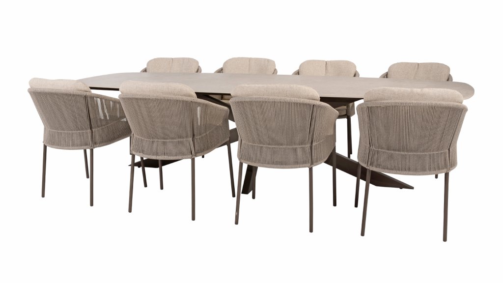 A beautiful, elegant table with a stunning oval ceramic top, available in either 240cm or 300cm. The top not only exudes refinement but also has a striking, modern look. The striking cross leg is available in three colors, allowing you to effortlessly tailor this table to your needs and preferences. Whether you choose industrial black, warm latte, or chic terre, each color adds a unique character and a touch of luxury to the table. With its generous dimensions, this table offers ample space for a cozy meal with friends or an intimate dinner with family. The combination of refined ceramics and the strong, stylish base ensures that this table is not only functional but also makes a stunning statement in your garden.