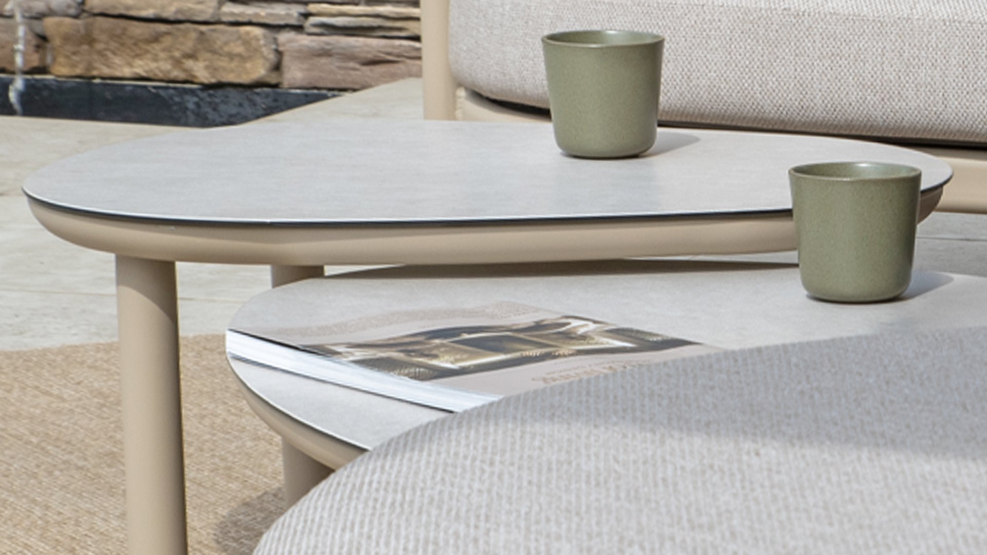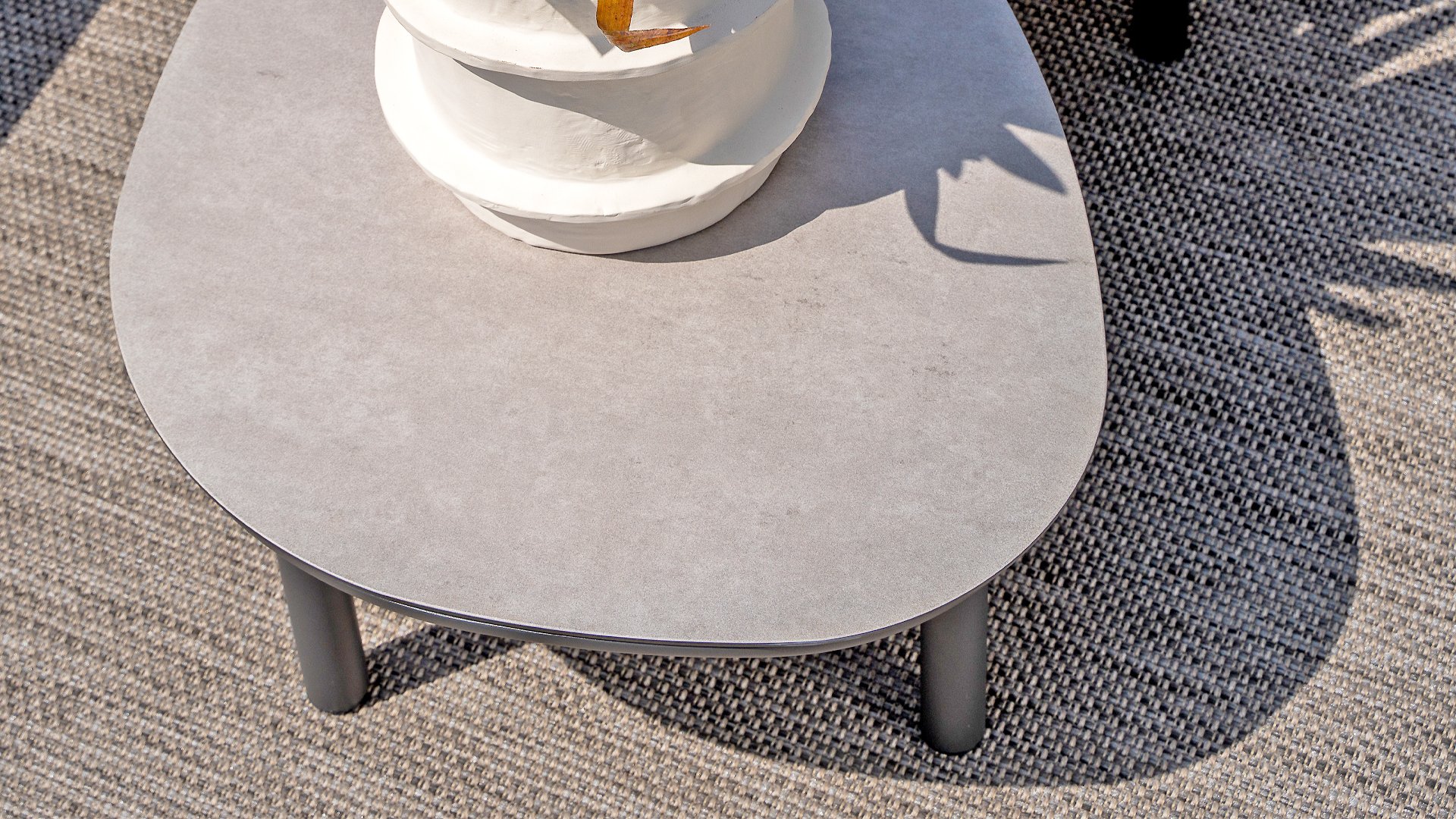 Bring a touch of elegance and refinement to your living space with the Monroe coffee table series from Taste by 4 Seasons Outdoor. This beautiful set consists of two organically shaped tables with pebble-shaped tops – playful, yet perfectly balanced. Thanks to its distinctive design, the Monroe becomes a stylish focal point of any outdoor or indoor space. The tops are crafted from printed ceramic on glass, creating a luxurious look and a durable, easy-to-maintain surface. The powder-coated aluminum base provides a sturdy foundation with a modern, airy look. The set comes in two sizes – Ø65xH32cm and Ø80xH27cm – that fit together perfectly or can be placed separately for a dynamic ensemble. Available in three stylish colors – Terre, Latte, and Anthracite – so you can effortlessly coordinate the Monroe with your interior or garden setting.