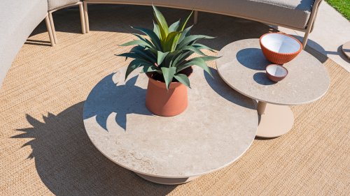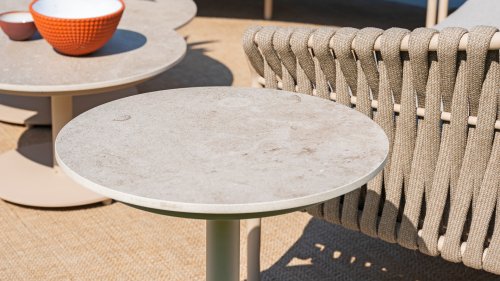 Discover the beauty and versatility of the 4 Seasons Outdoor Boaz round coffee table with its stunning ceramic tabletop and powder-coated frame. This table adds a touch of natural elegance to your outdoor space and is designed with attention to detail. Noteworthy is the central leg and the robust base, making the 4Seasons Boaz table extremely stable. The Boaz table series comes in 3 sizes and 2 colors: Terre and Latte.