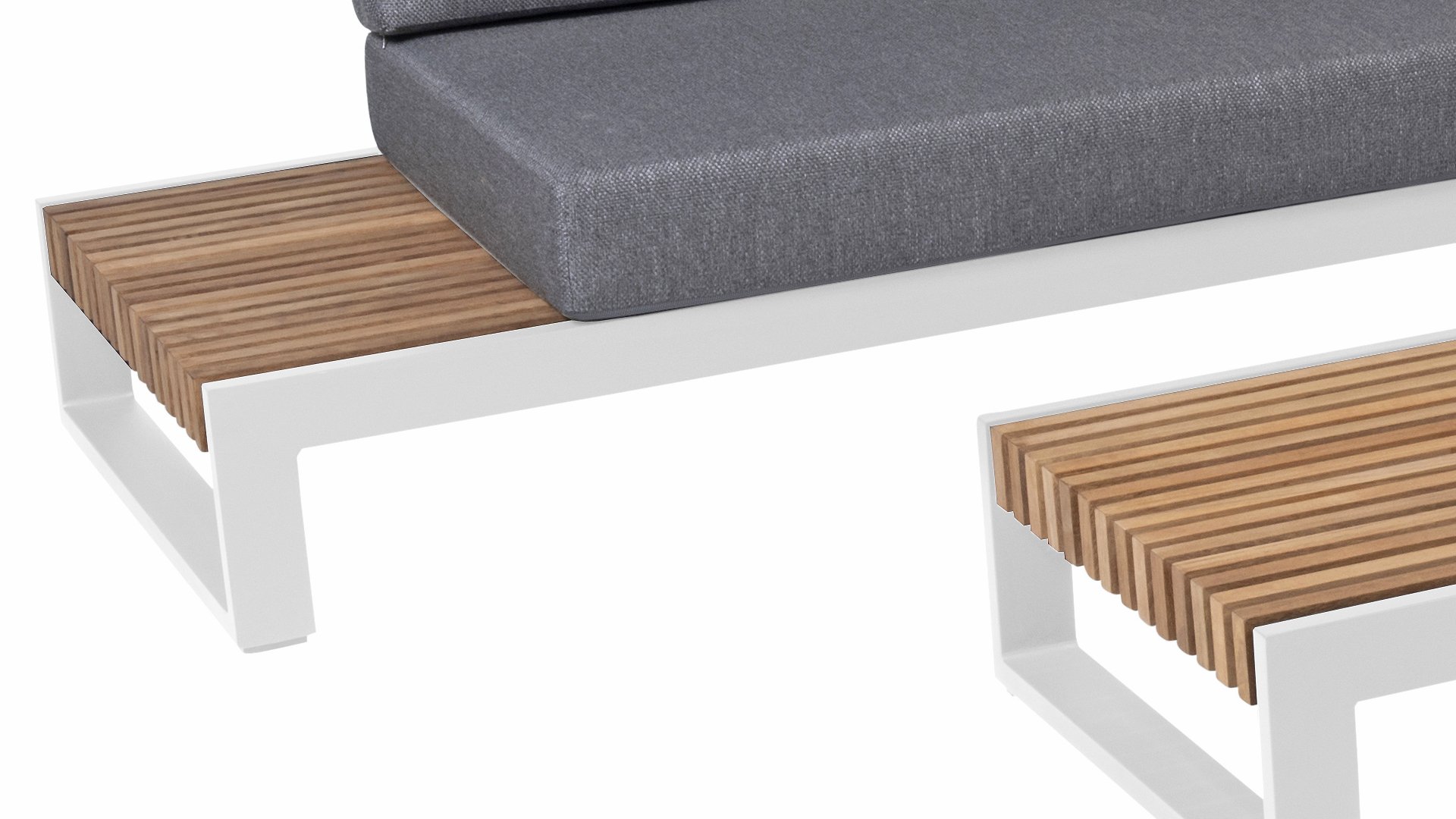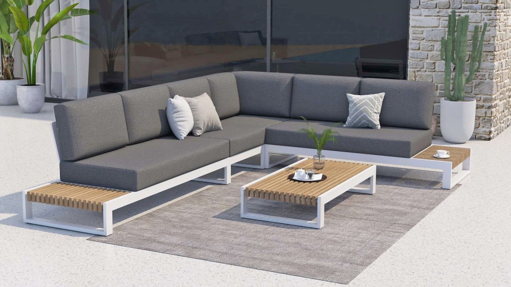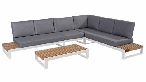 The Kioto series consists of an aluminum frame with teak wood parts. To maintain the beautiful appearance of the teak wood, we recommend treating it with our teak maintenance products. This way, you can enjoy this beautiful Kioto Lounge set for a long time!