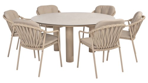 The Donato table is a stunning addition to any dining area, with a diameter of 160cm that is ideal for cozy gatherings. What makes this table special is the design of the legs; with a total of three legs arranged in a "triangle," it offers not only stability but also a striking playful look. The ceramic tabletop on glass gives a luxurious appearance while being easy to maintain. In the Taste by 4 Seasons Outdoor Donato series, there are several options available, as it is available as a dining table in the colors: Taste 4Seasons Donato Table Ø160cm Latte & Taste 4Seasons Donato Table Ø160cm Terre, allowing you to choose the perfect match for your interior. To pass the mayonnaise or milk to the person opposite you, simply add the: Taste 4Seasons Donato Lazy Susan to the whole setup. In addition, there is also a low dining variant available in the colors Latte and Terre, perfect for an informal and relaxed dining experience: Taste 4Seasons Donato Low Dining Table Ø160cm Latte, Taste 4Seasons Donato Low Dining Table Ø160cm Terre. What else?