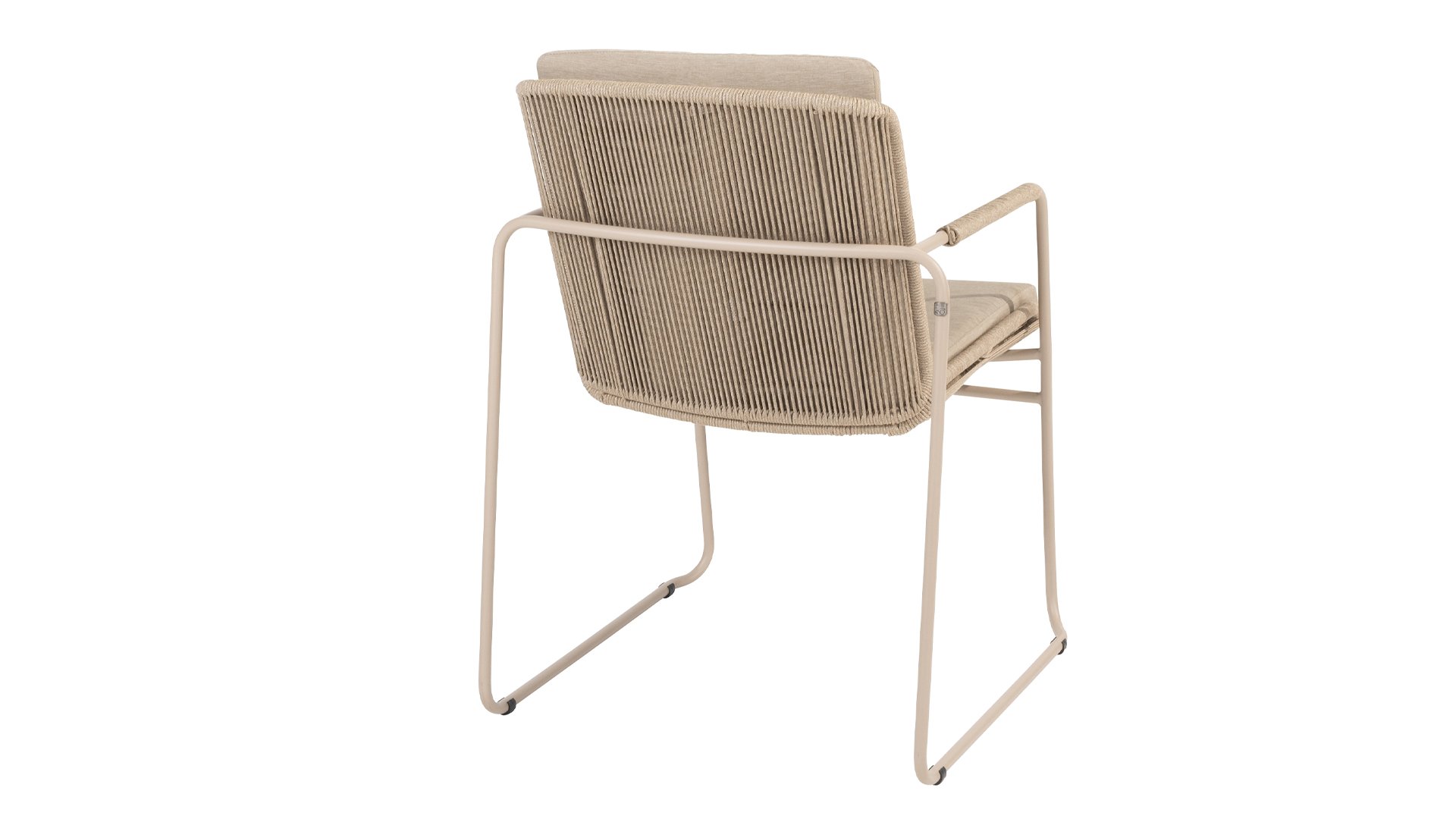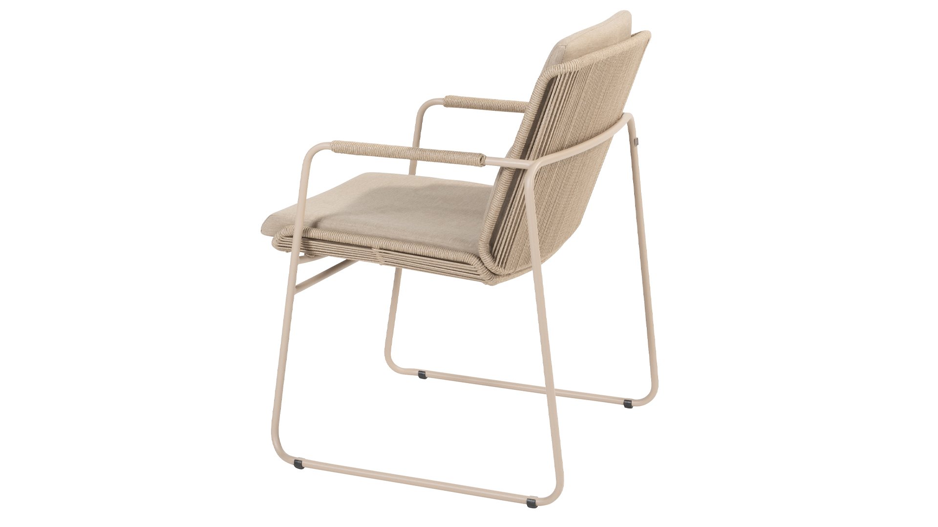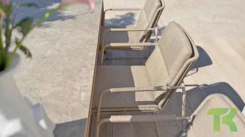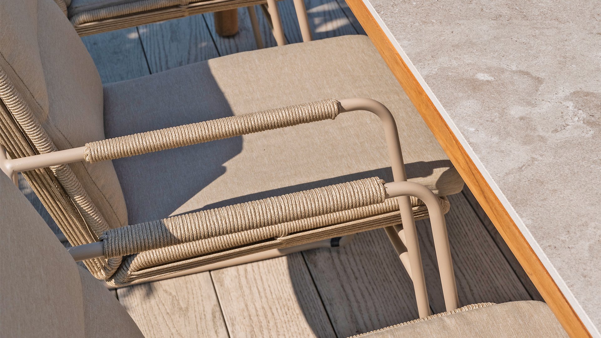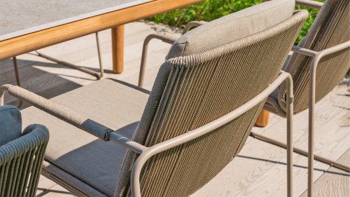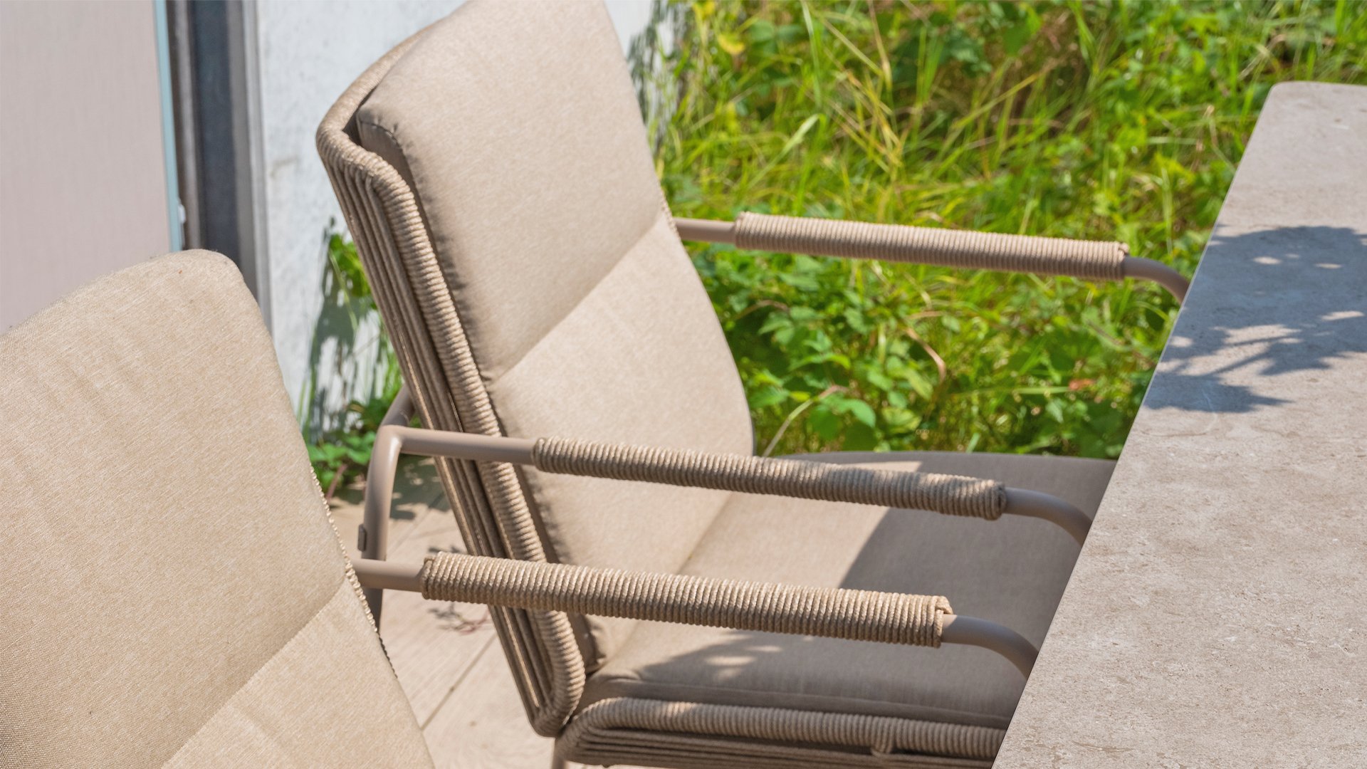 The latte rope upholstery and latte stainless steel frame give the Parma dining chair a contemporary and timeless look that fits into any outdoor setting. The soft armrests provide extra comfort during long meals and relaxing evenings.