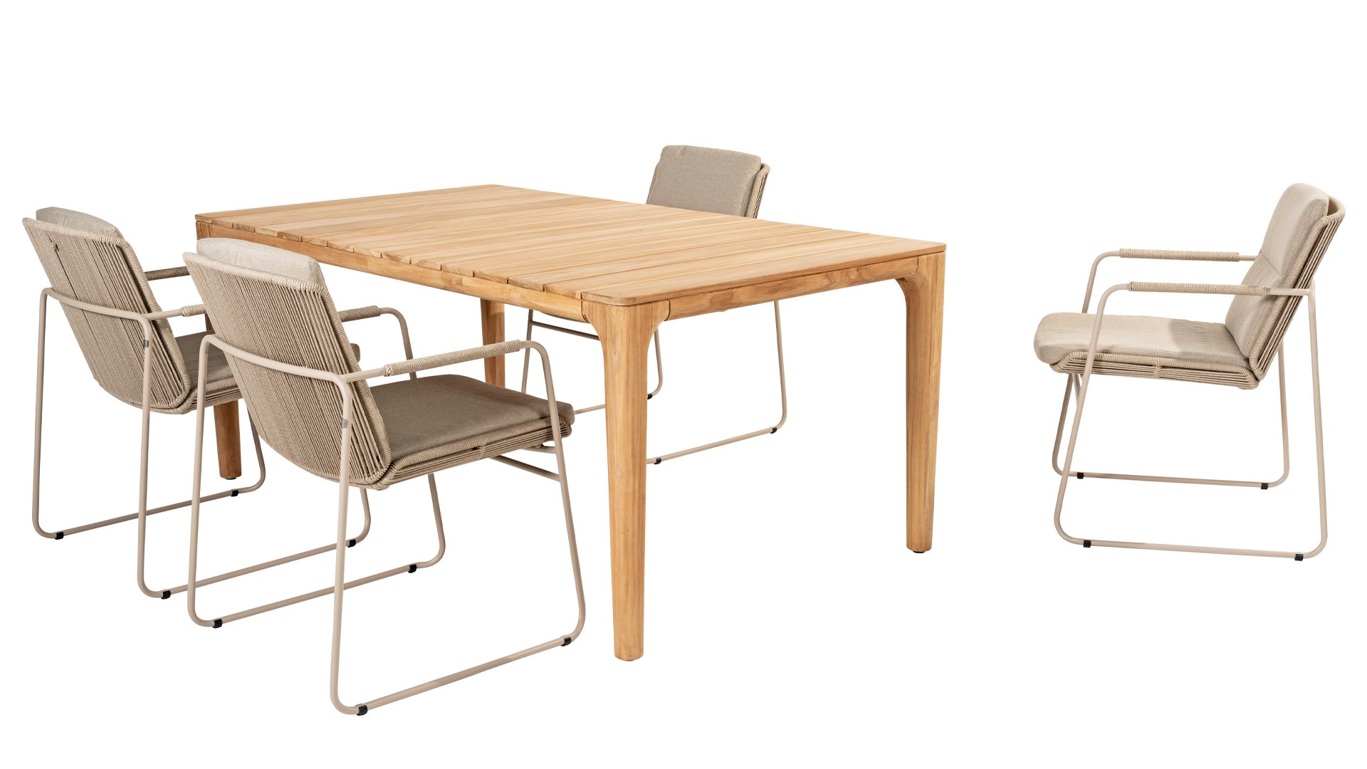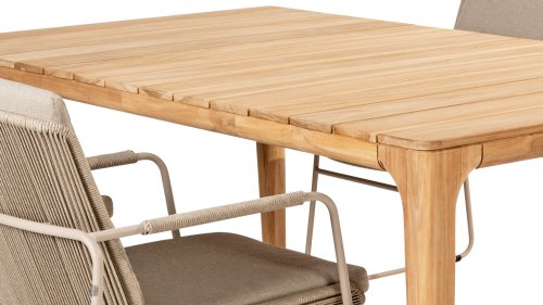 The Liam table by Taste 4SO has an elegant design that will definitely be noticed when it's placed in a space. The tabletop stands out because the slats are positioned widthwise. This tabletop sets it apart from most other tables and gives it a contemporary and original appearance. The Liam table has a beautiful, elegant base that beautifully complements the tabletop. The table is made entirely of teak wood, can be left outside all year round, and is also available in the 240cm size. View the Taste 4Seasons Liam 240 here.