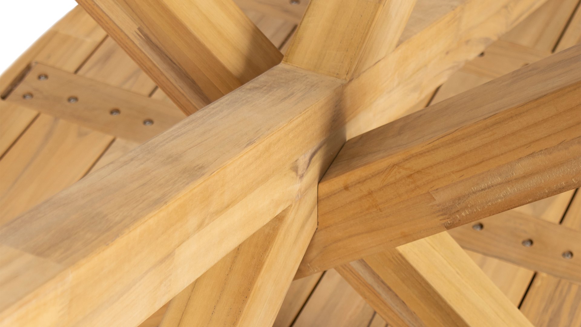 Teak is a natural product and particularly suitable for outdoor use. It is resistant to pests and mold and can withstand sun, rain, and snow. Over time, teak develops a silver-gray patina. Teak is a robust material and requires little maintenance. If you prefer the original color of your teak, you can easily prevent it from turning gray by regularly using our care product. You can also clean teak with green soap. We offer a warranty on all manufacturing and construction defects. This does not include the working of teak. When you choose teak, we expect you to appreciate these qualities. Hairline cracks that may develop, knots in the teak, and rough surfaces or irregular discoloration over time are not covered by our warranty. These characteristics give teak its unique character and appearance; they are part of its natural properties. Be careful with a flowerpot or vase on your teak garden table, as this can cause persistent rings or color variations. Imperfections are common; these imperfections are characteristic of this product. These irregularities can never give ground to a claim, warranty, or complaint. This is a signs ans signature of originality!