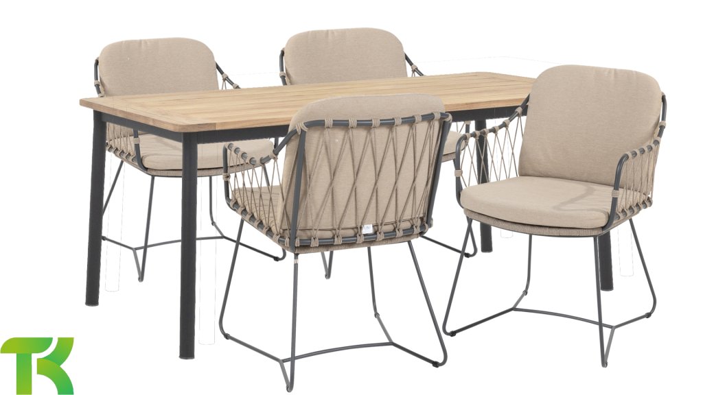 The Applebee Elle table, a minimalist yet beautiful design by AppleBee. This table belongs to the Elle dining series, where the choice between the garden chair rope or aluminum is obvious. The chair contains teak armrests that naturally match the wood of the table. The bases of the Elle series come in the color matte black.