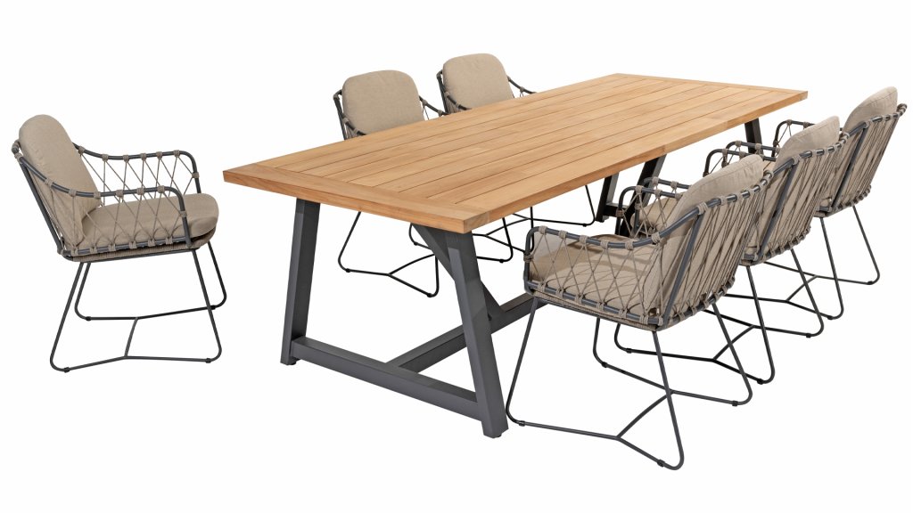 The Prego dining chair is made with high-quality taupe rope and has a sturdy frame of anthracite stainless steel and aluminum, making it resistant to changing weather conditions. The included cushions provide extra comfort during long, relaxed dinners or cozy gatherings outdoors.