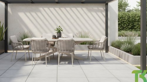 A beautiful, elegant table with a stunning oval ceramic top, available in either 240cm or 300cm. The top not only exudes refinement but also has a striking, modern look. The striking cross leg is available in three colors, allowing you to effortlessly tailor this table to your needs and preferences. Whether you choose industrial black, warm latte, or chic terre, each color adds a unique character and a touch of luxury to the table. With its generous dimensions, this table offers ample space for a cozy meal with friends or an intimate dinner with family. The combination of refined ceramics and the strong, stylish base ensures that this table is not only functional but also makes a stunning statement in your garden.