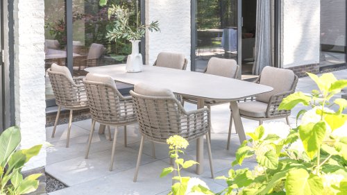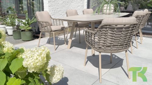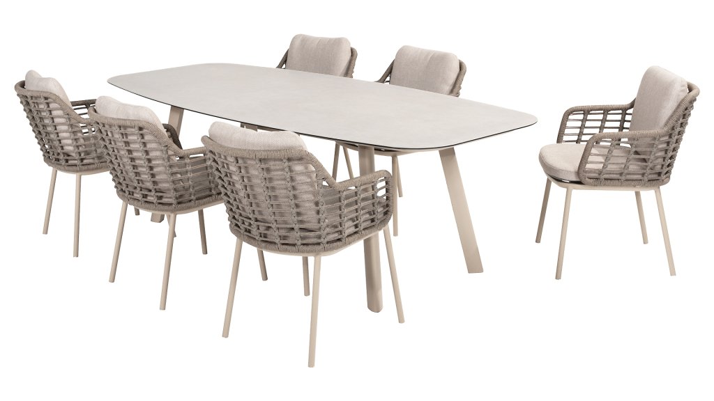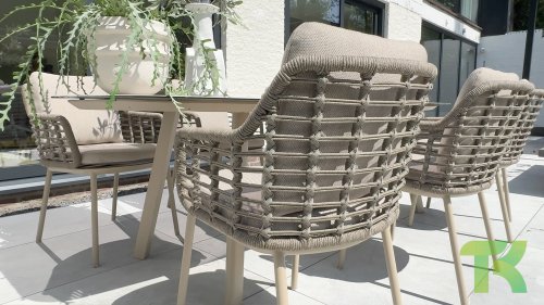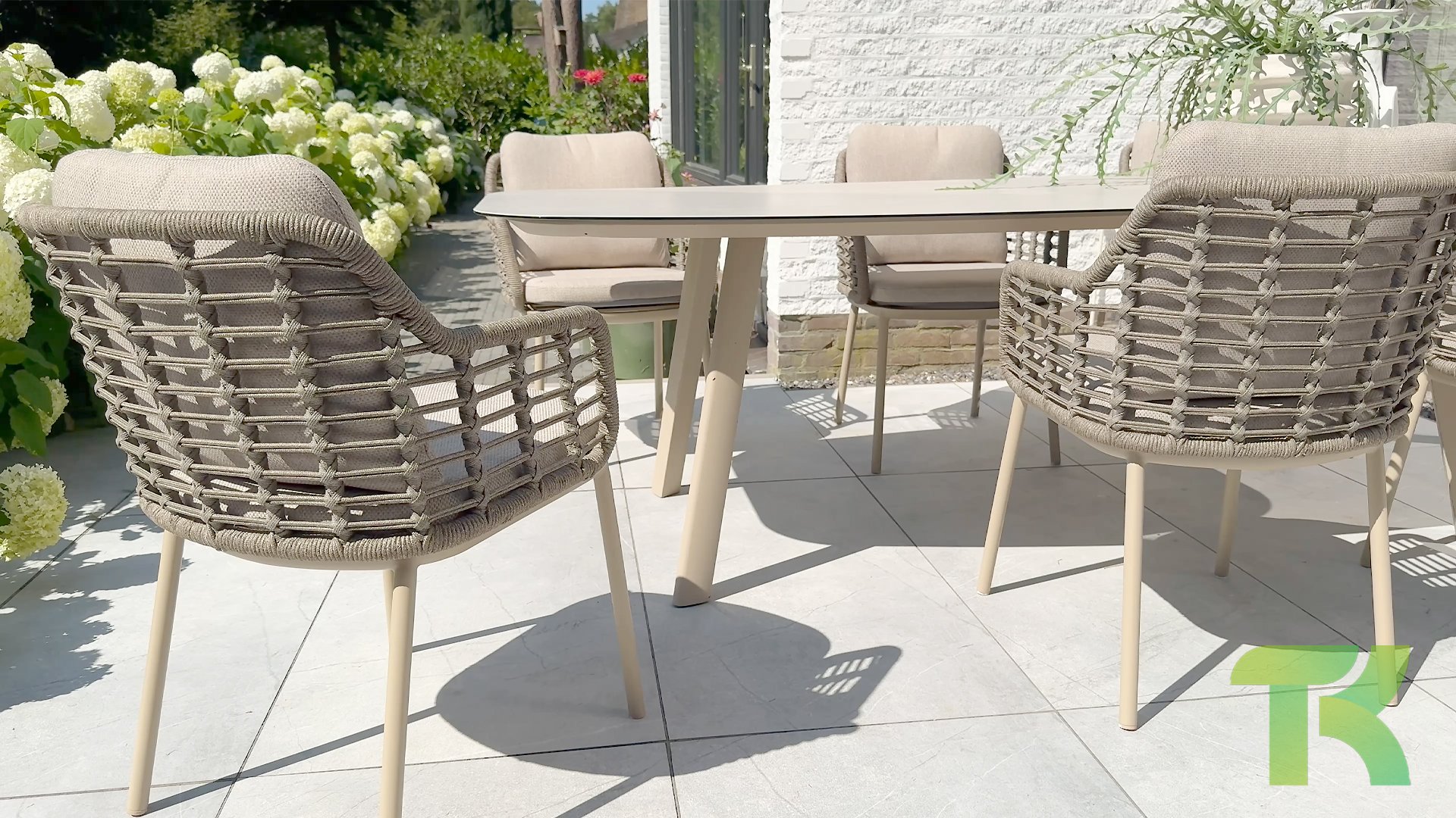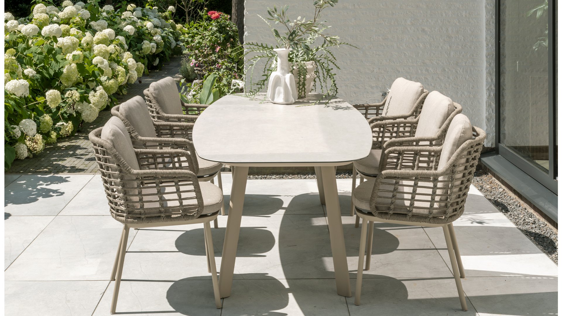Bring the warm, authentic atmosphere of Southern Italy to your own patio. This collection is an absolute must-have for those seeking a combination of high-quality design, organic shapes, and ultimate seating comfort. The strength of the Puglia series lies in its clever blend of materials. The frame is made of powder-coated aluminum; lightweight and rustproof. The back and armrests are expertly woven with high-quality rope thread. This gives the chairs and benches an open, airy look that fits perfectly in the modern garden. To complete the comfort, the furniture is fitted with cushions made of Olefin fabric. This material is not only wonderfully soft but also dirt-repellent and weather-resistant. So, an unexpected summer shower is no problem at all. The Taste 4Seasons Puglia series is available in two beautiful colorways, each with its own unique possibilities:
