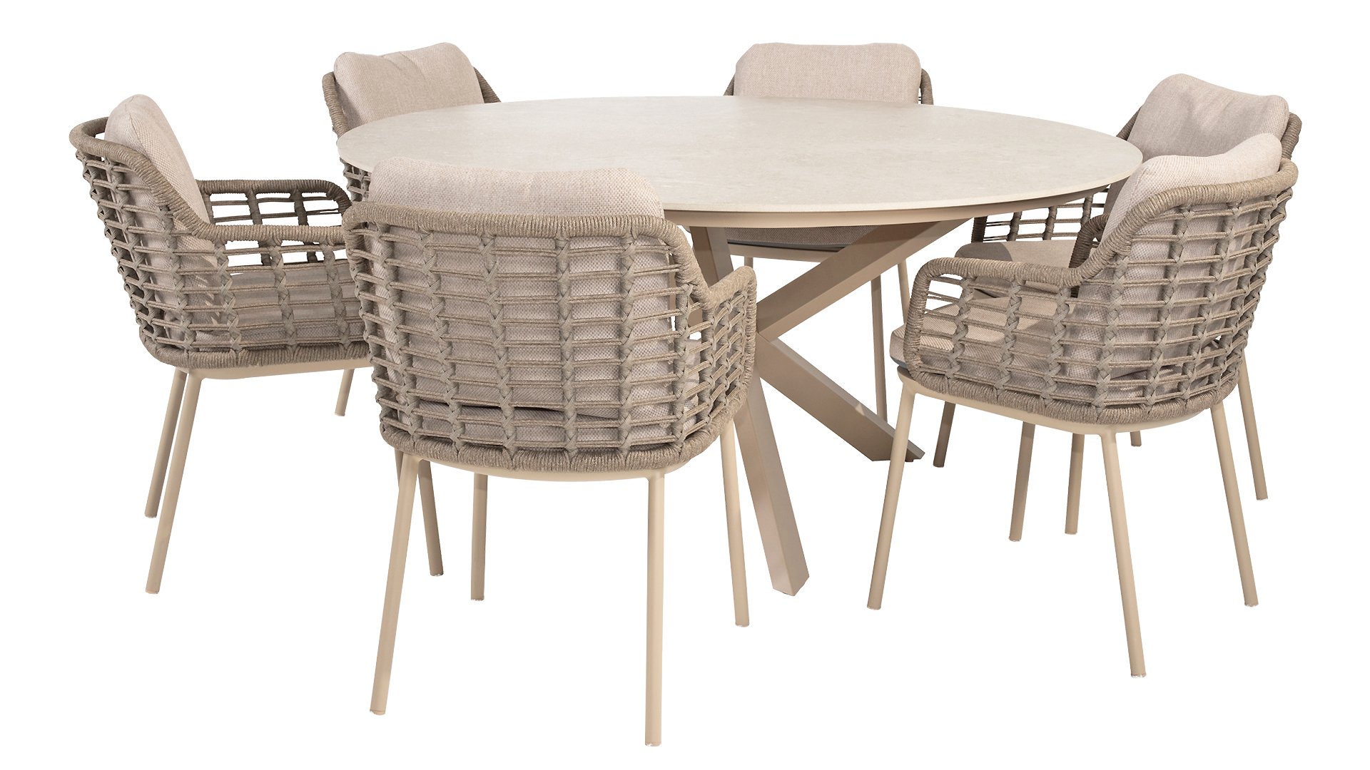 Bring the warm, authentic atmosphere of Southern Italy to your own patio. This collection is an absolute must-have for those seeking a combination of high-quality design, organic shapes, and ultimate seating comfort. The strength of the Puglia series lies in its clever blend of materials. The frame is made of powder-coated aluminum; lightweight and rustproof. The back and armrests are expertly woven with high-quality rope thread. This gives the chairs and benches an open, airy look that fits perfectly in the modern garden. To complete the comfort, the furniture is fitted with cushions made of Olefin fabric. This material is not only wonderfully soft but also dirt-repellent and weather-resistant. So, an unexpected summer shower is no problem at all. The Taste 4Seasons Puglia series is available in two beautiful colorways, each with its own unique possibilities: