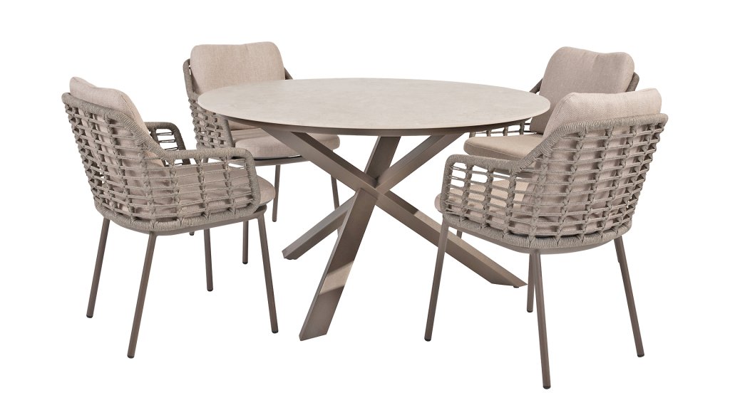 Bring the warm, authentic atmosphere of Southern Italy to your own patio. This collection is an absolute must-have for those seeking a combination of high-quality design, organic shapes, and ultimate seating comfort. The strength of the Puglia series lies in its clever blend of materials. The frame is made of powder-coated aluminum; lightweight and rustproof. The back and armrests are expertly woven with high-quality rope thread. This gives the chairs and benches an open, airy look that fits perfectly in the modern garden. To complete the comfort, the furniture is fitted with cushions made of Olefin fabric. This material is not only wonderfully soft but also dirt-repellent and weather-resistant. So, an unexpected summer shower is no problem at all. The Taste 4Seasons Puglia series is available in two beautiful colorways, each with its own unique possibilities: