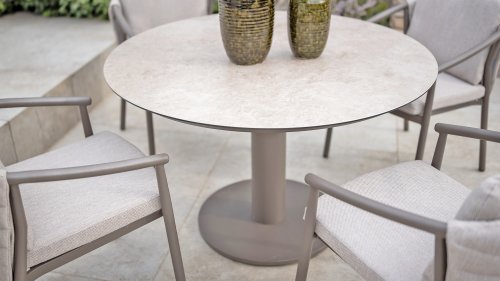 The high-quality printed ceramic top not only creates a luxurious look but is also exceptionally strong, scratch-resistant, and easy to maintain. The central leg offers maximum legroom and gives the table a modern, airy look. The Taste by 4 Seasons Outdoor Sarah is available in two versions and two colors. The table is available in two sizes: 120x75cm (dining) and 130x69cm (low dining), in the colors Latte and Terre. Check them out below:
