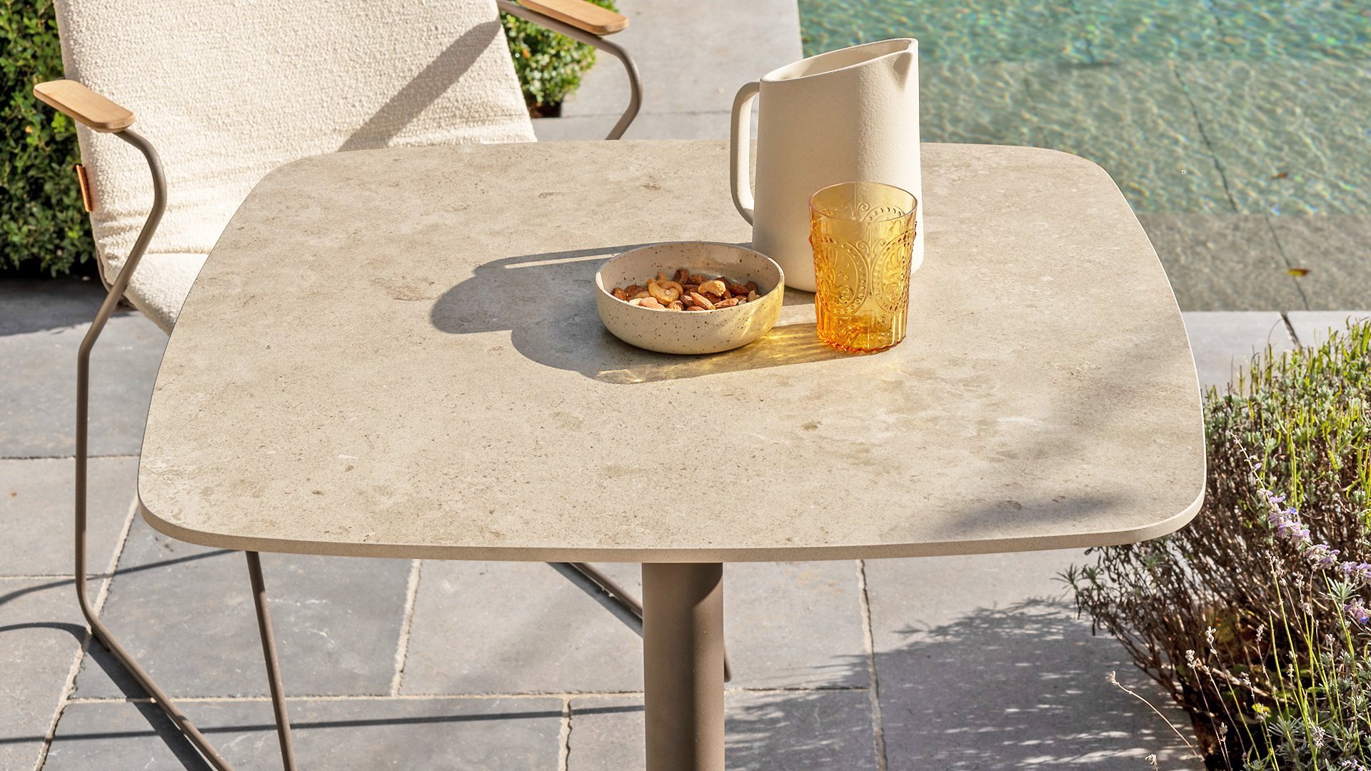 This material has been used for decades as flooring, finishing in bathrooms, and luxury (outdoor) swimming pools. It's no wonder this durable material is known for its extreme hardness. Its beautiful appearance makes ceramic highly distinctive and sought-after. Ceramic is a blend of natural materials similar to a type of clay. It is fired at very high temperatures, creating a light yet very strong material that is extremely scratch-resistant and can also withstand extreme temperatures. As mentioned, ceramic has several unique properties that offer significant advantages, especially for outdoor use. Heat and cold are no problem for ceramic, so garden tables can remain outdoors year-round. For normal soiling, simply wipe the top with a damp cloth. Stains can be removed with lukewarm water and green soap, and limescale can be treated with natural vinegar. However, never use harsh abrasives, such as sandpaper, or aggressive agents like acids and chemicals. Spills of this type must be removed immediately to prevent irreparable damage. Note: We strongly advise against cleaning your ceramic garden furniture with a pressure washer or harsh cleaning agents and/or bleach. We advise against covering your furniture for extended periods or covering it with decorations or other items, as this can cause permanent stains or discoloration. Always be careful with fire, oil, grease, or hot objects near your furniture, as this can cause permanent damage.