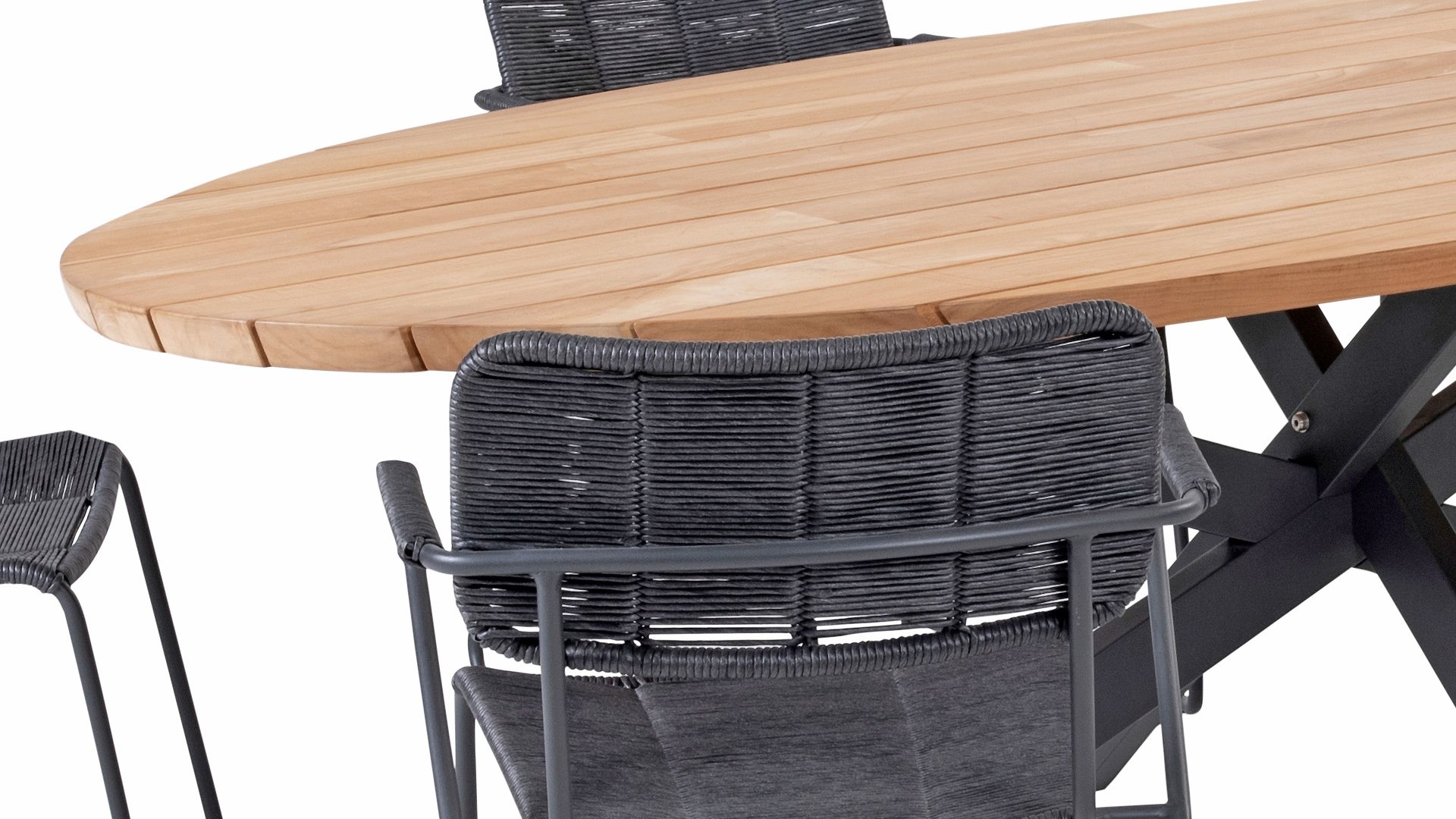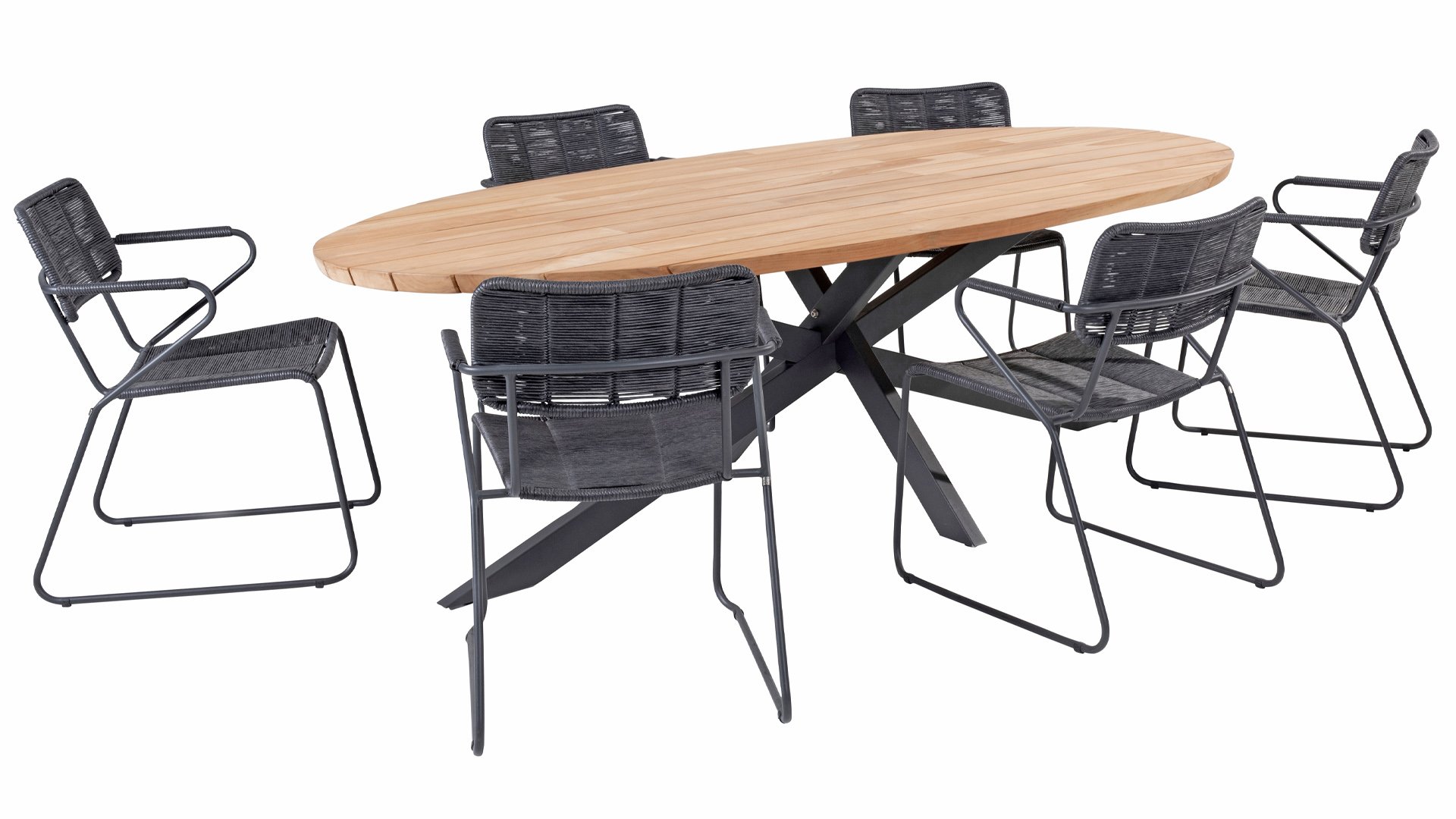 6 x Taste Swing Dining stacking chair Anthracite 1 x Taste Prado Ellips table 240x115cm Teak-Alu Anthracite Dim. Set: ± 231x240x81cm (LxWxH)Taste 4Seasons Swing